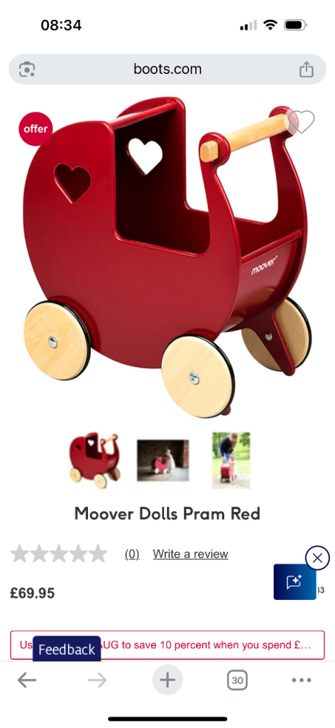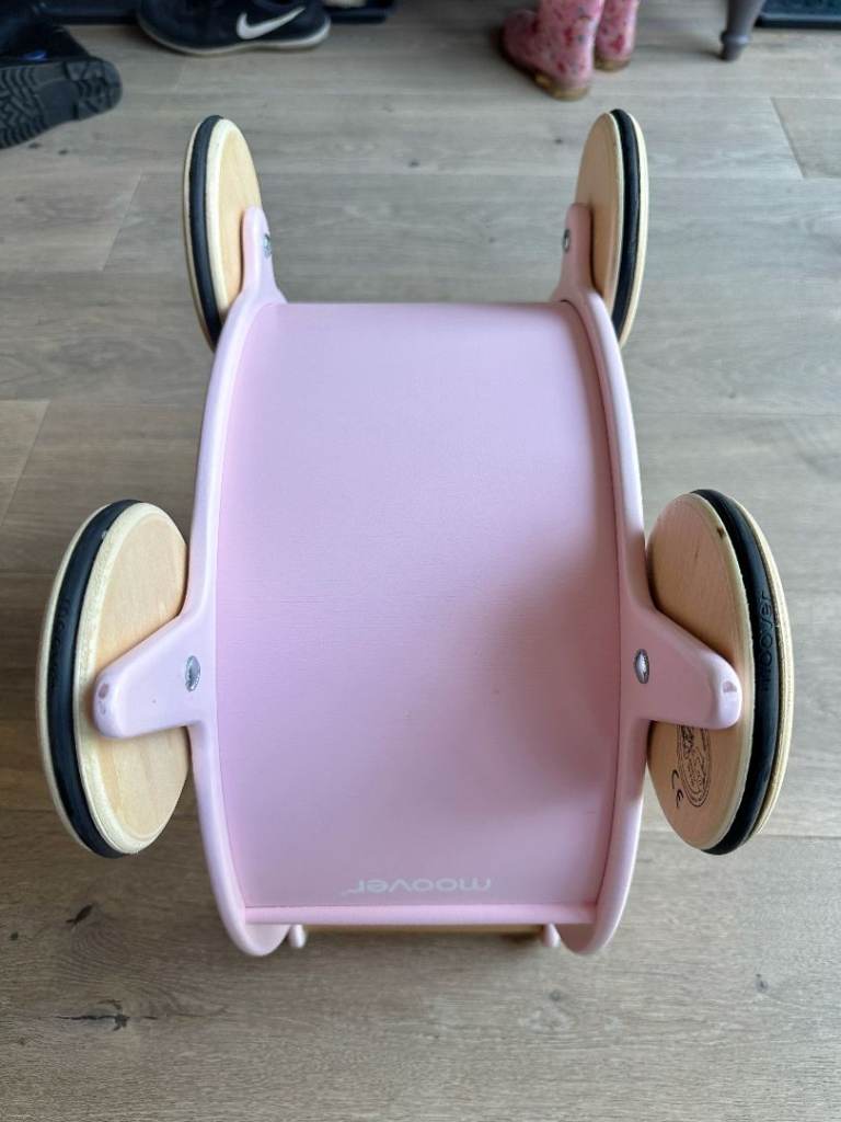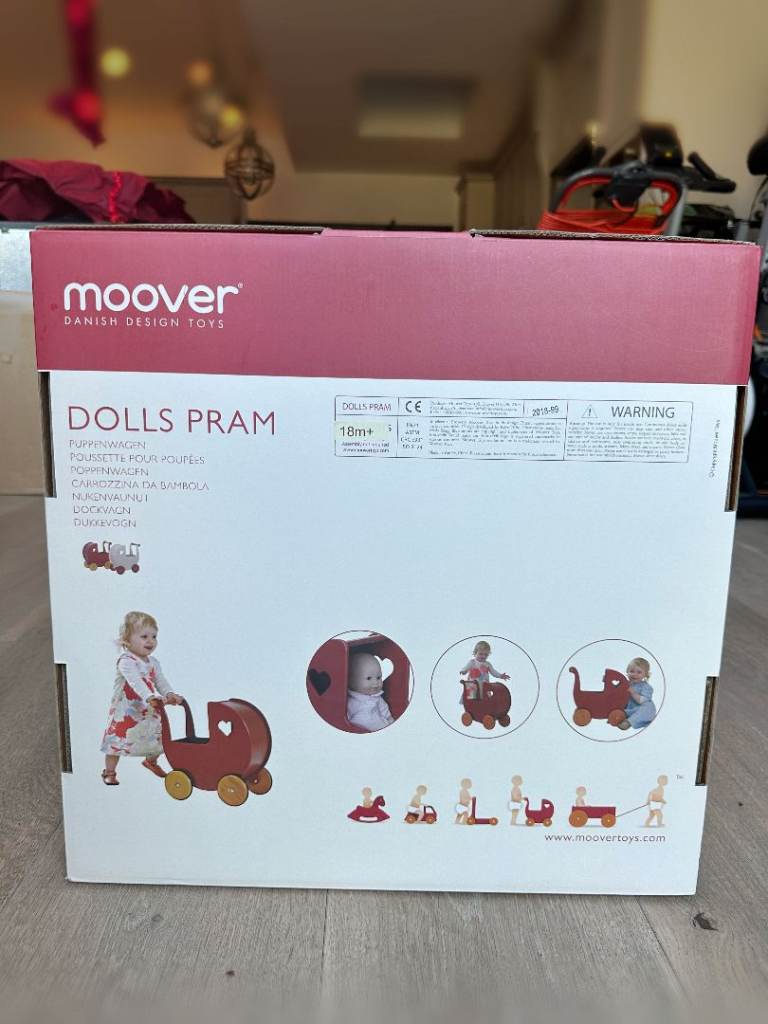 This beautiful Moover children’s wooden dolls pram is made in MDF and has wooden wheels with rubber tyres. The dolls pram is delivered assembled and ready to use.