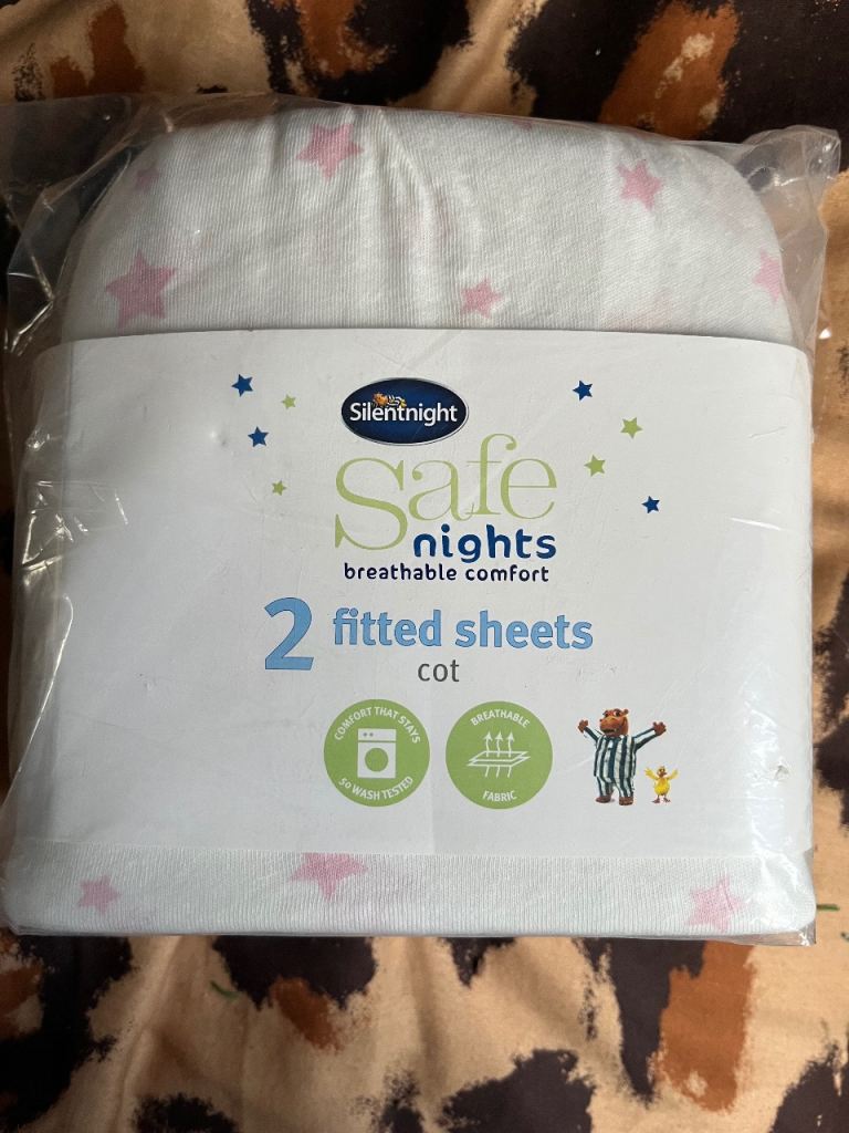 BRAND NEW SILENT NIGHT PACK OF 2 FITTED SHEETS FOR A COT, IN WHITE WITH PINK STARS. COLLECTION ONLY.