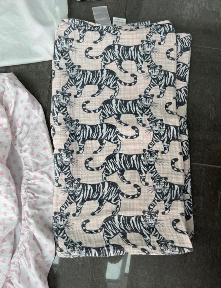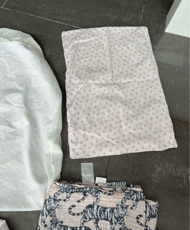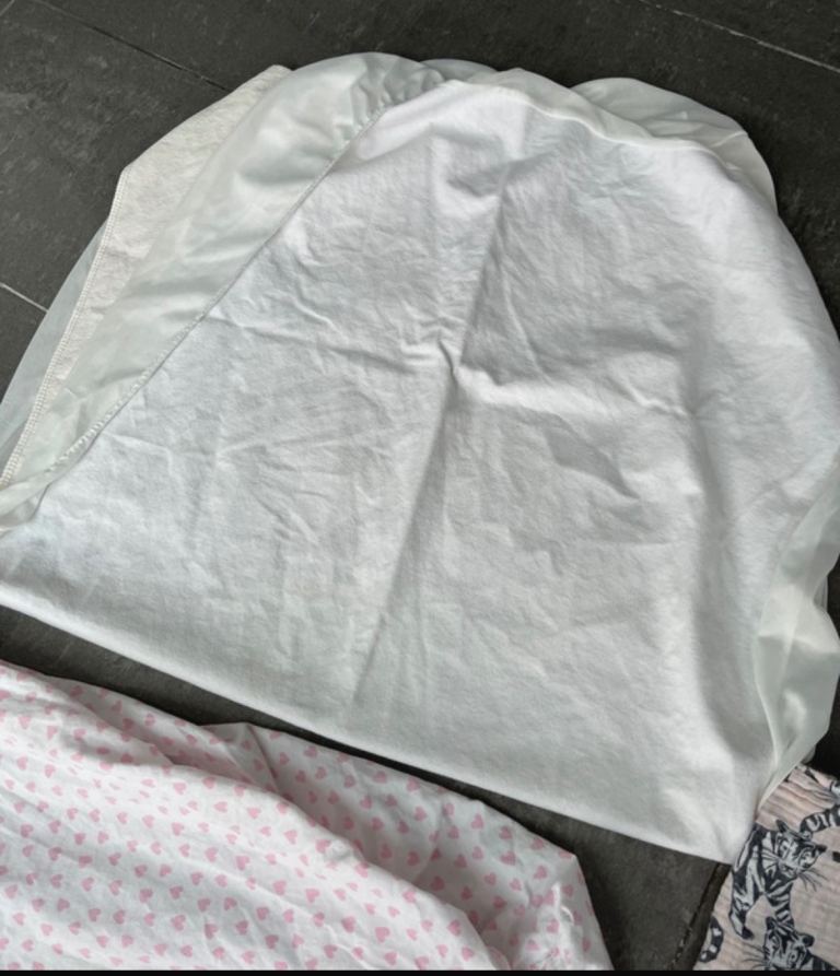 Cot bedding fitted mattress protector, fitted sheet and pillow cover and a muslin sheet all excellent condition