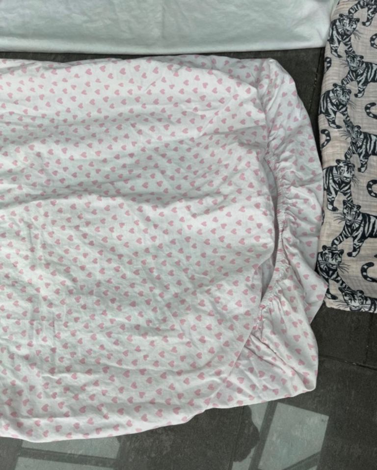 Cot bedding fitted mattress protector, fitted sheet and pillow cover and a muslin sheet