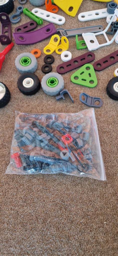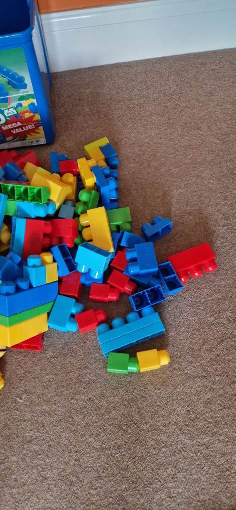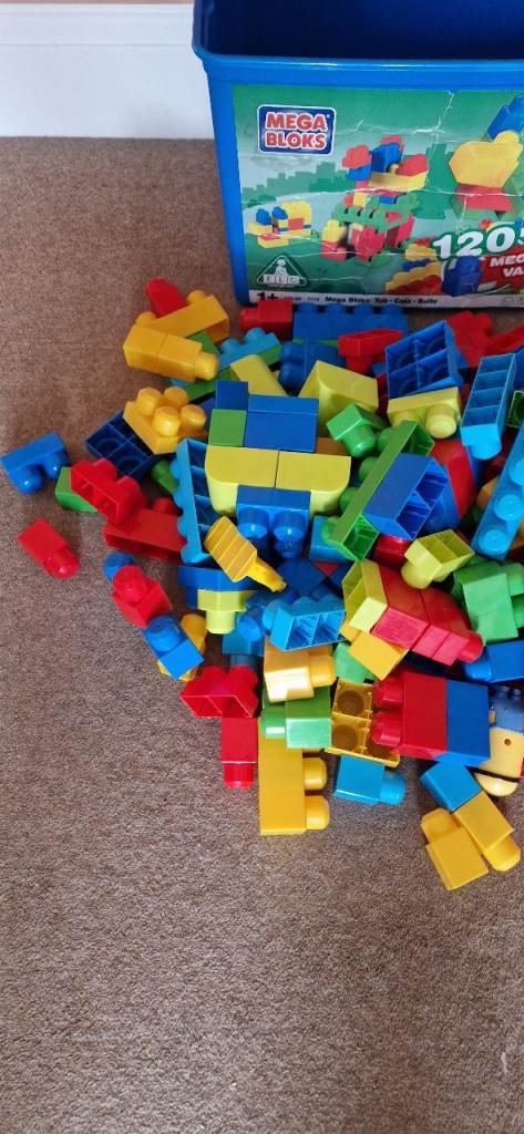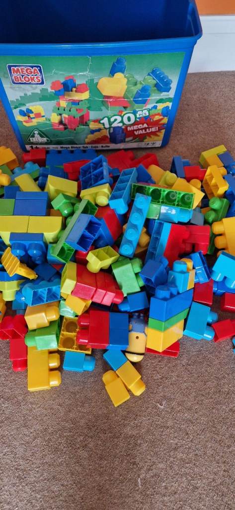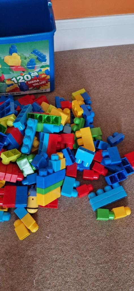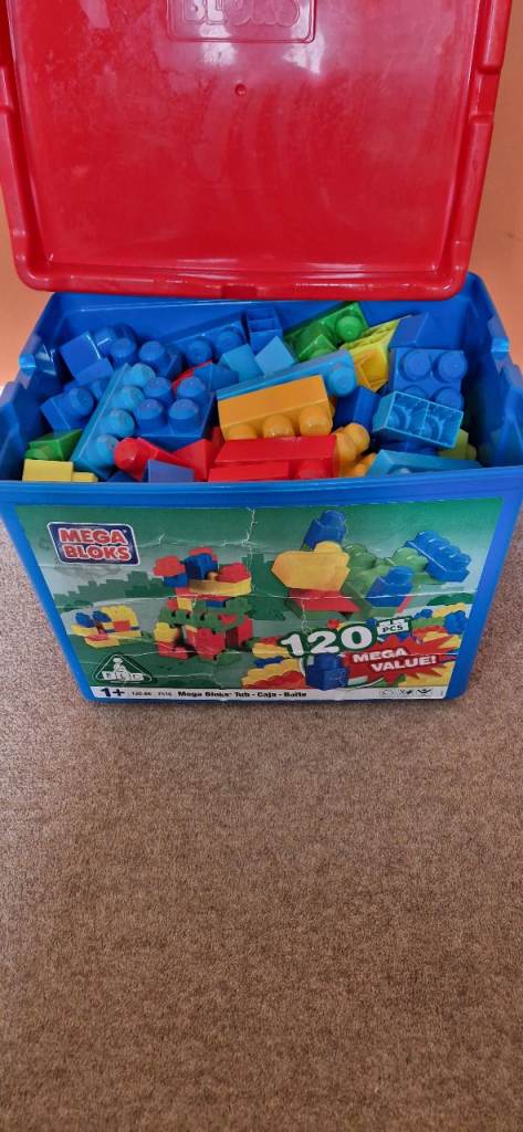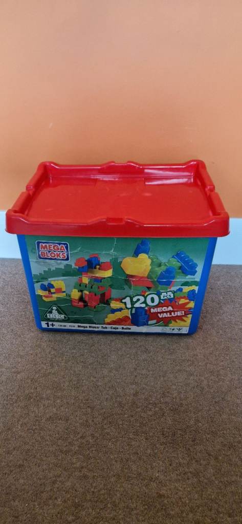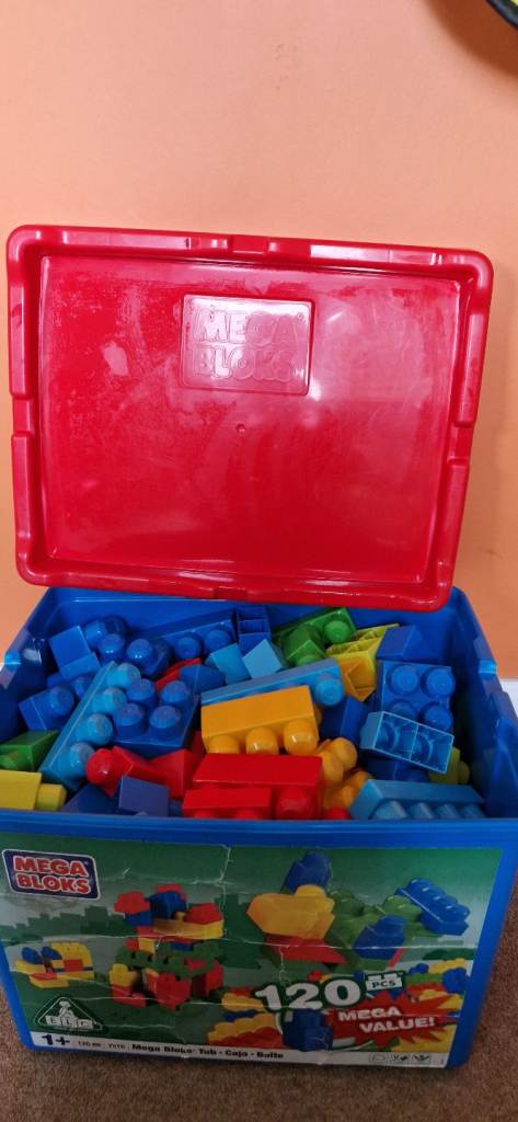 190 MEGA BLOKS IN A PLASTIC STORAGE BOX WITH LID. EXCELLENT CONDITION.