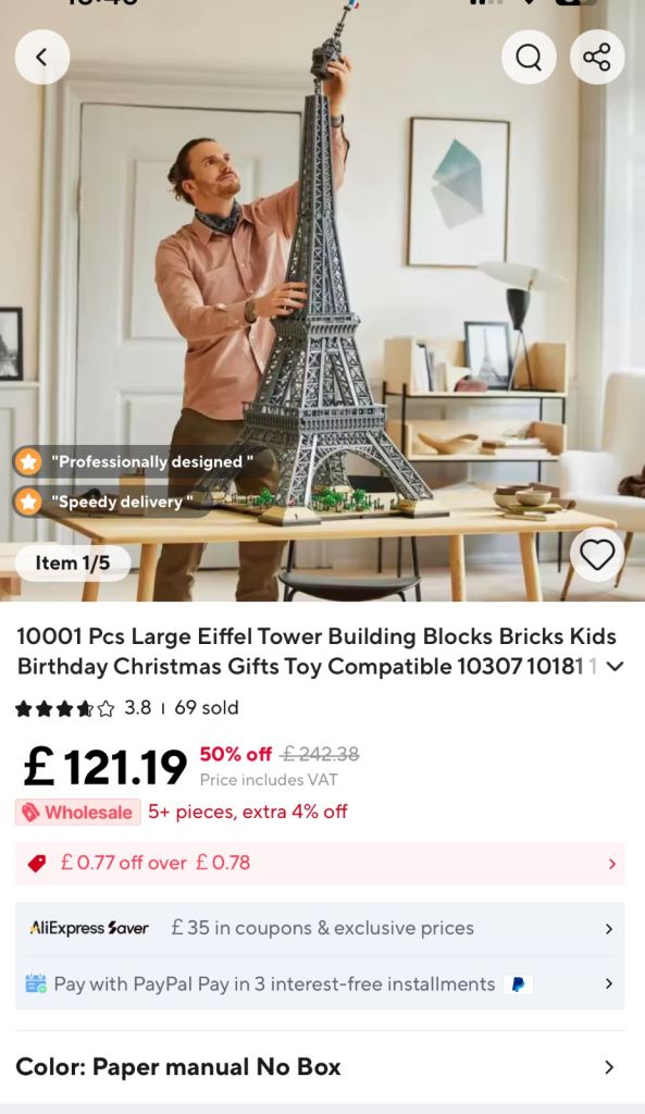 Aliexpress lego style Eiffel Tower . purchased from Aliexpress but my son got frustrated so far into building that he’s given up! Originally paid £120 , asking for £80 didn’t come with a box being Aliexpress but has instructions an all else 👍🏻 (LEGO version around £550!)