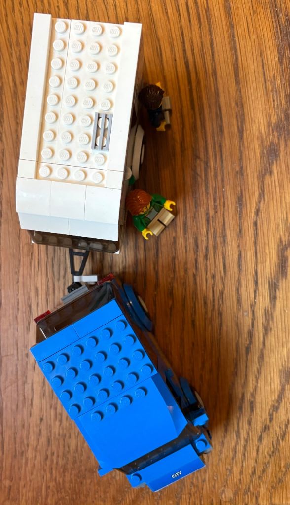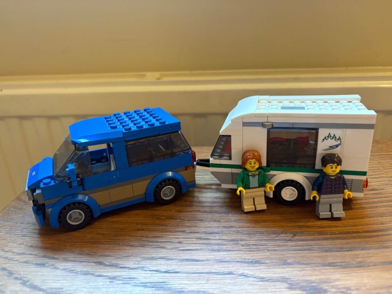 Spend some time camping with the family with this van with opening doors and detachable caravan that opens from the back, revealing a small kitchen and a bed, as well as a separate grill with sausages and a bone for the family dog, who unfortunately has gone walkabout! Includes 2 minifigures. Features a van with opening doors and detachable caravan that opens to reveal a small kitchen and bed. Load up the caravan, hook it onto the van and take off on a camping trip. Accessory elements include a grill, 2 sausages, bone, 2 mugs and a coffee machine. Van measures over 2” (6cm) high, 4” (12cm) long and 2” (6cm) wide.