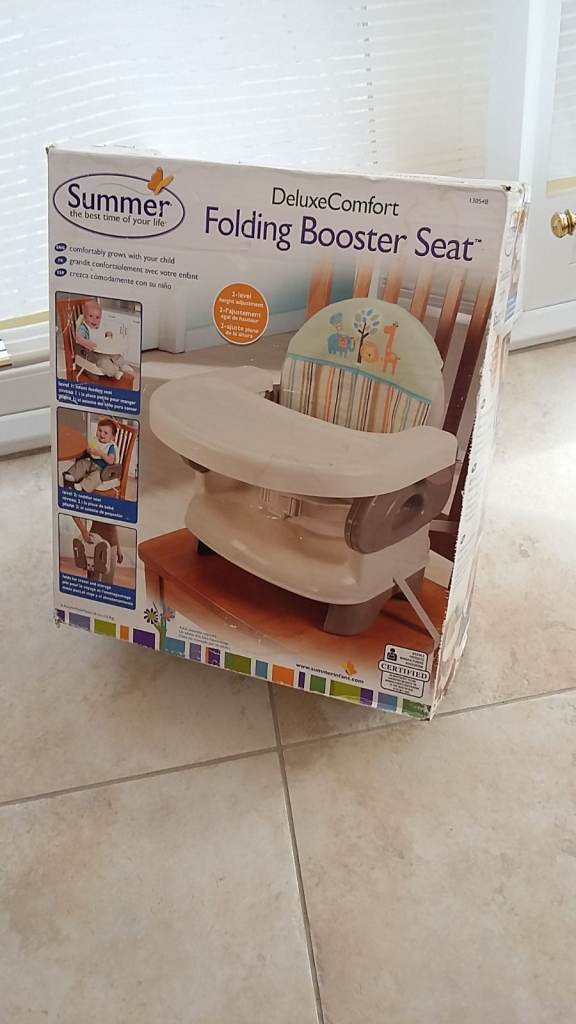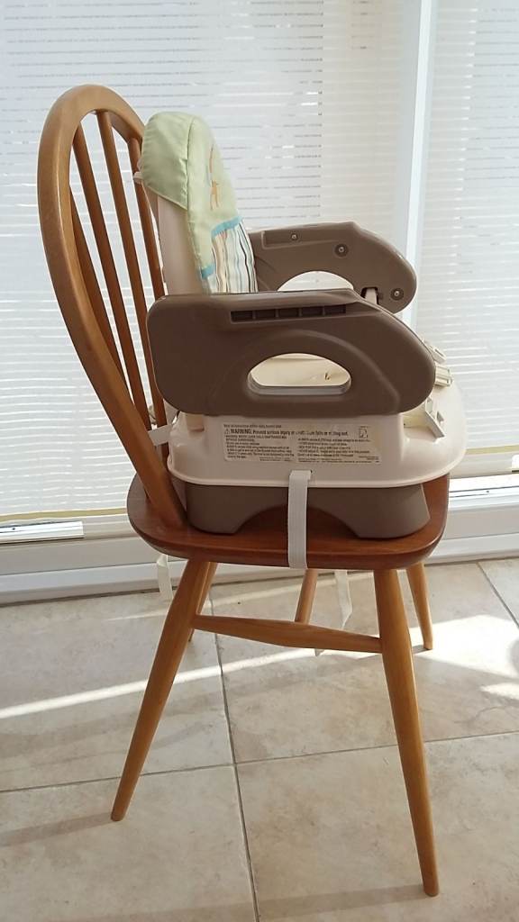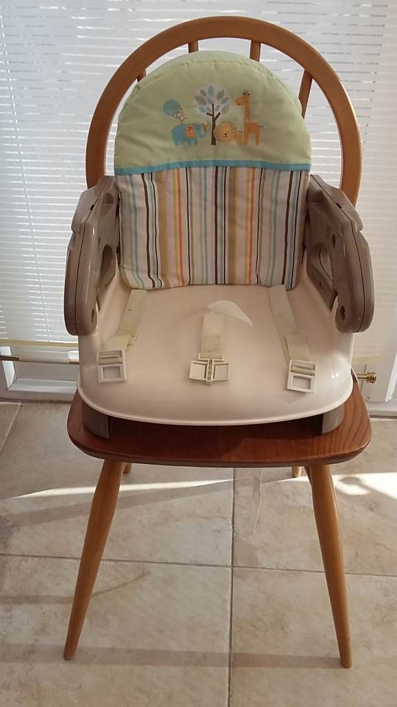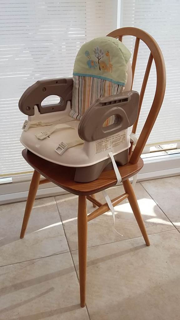 This booster chair seat will fit on to most domestic chairs. It is very stable to sit on and comes complete with detachable tray for baby meal times It is securely attached by four locking straps, two which lock beneath the chair seat and the other two which lock together behind the rear of the chair. We still have the original box for storage and importantly the instructions.