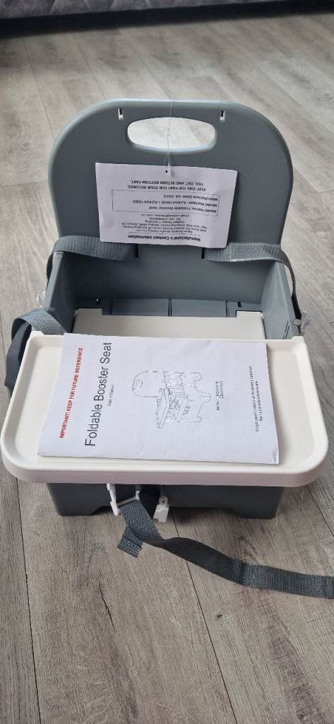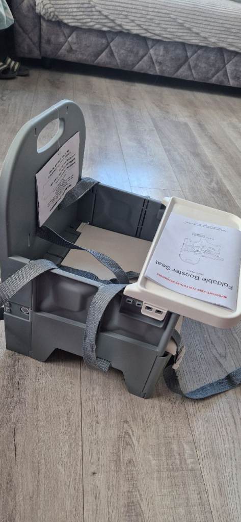 Brand new in good condition foldable booster seat in colour grey, ur able to attach on chairs with adjustable belts.