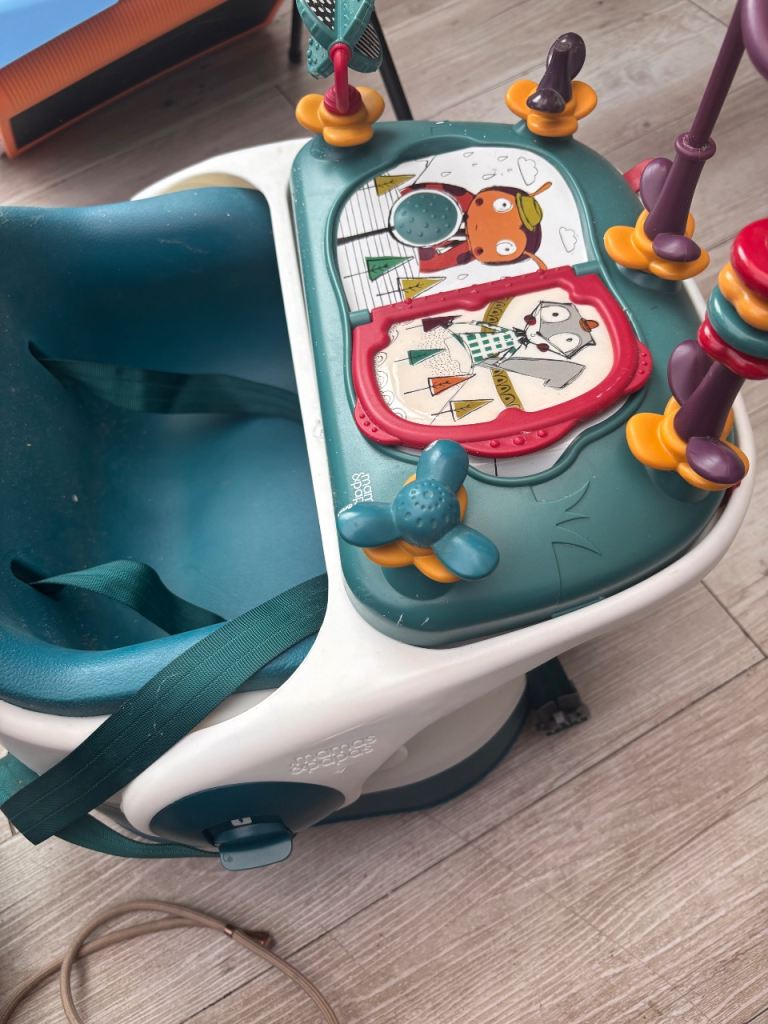 The height of the seat is adjustable and the tray can be removed. It comes with manual and storage bag for travel.