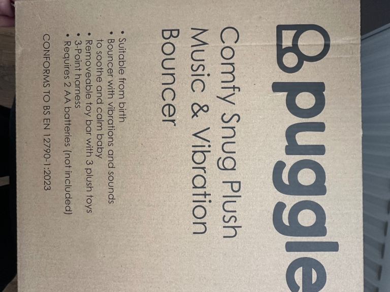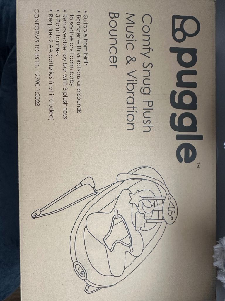 Posting for under a monthBrand new unopened grey puggle baby bouncer