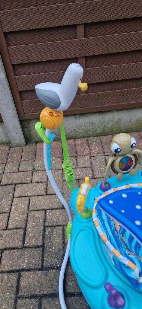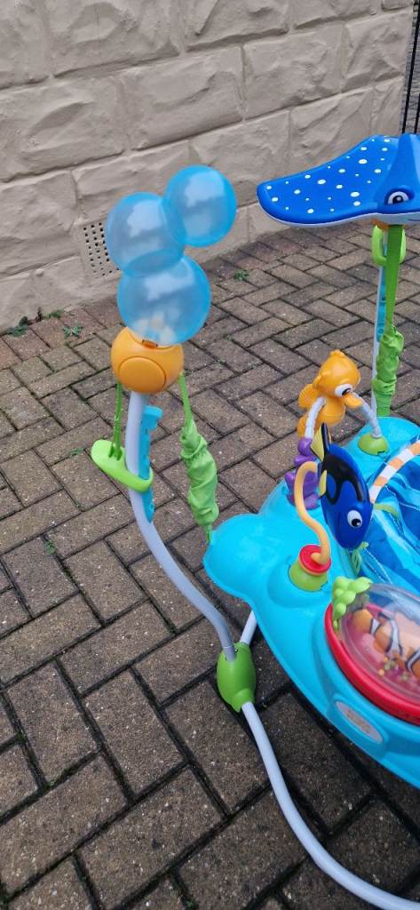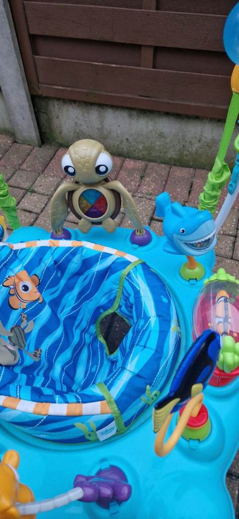 This Disney Finding Nemo baby jumper features a 360° spinning seat, so baby can jump, twist and play to discover an ocean of sights and sounds. With a high-back seat and 4 height adjustments, babies can steer their ship surrounded by dancing lights and a sea of Finding Nemo toys!