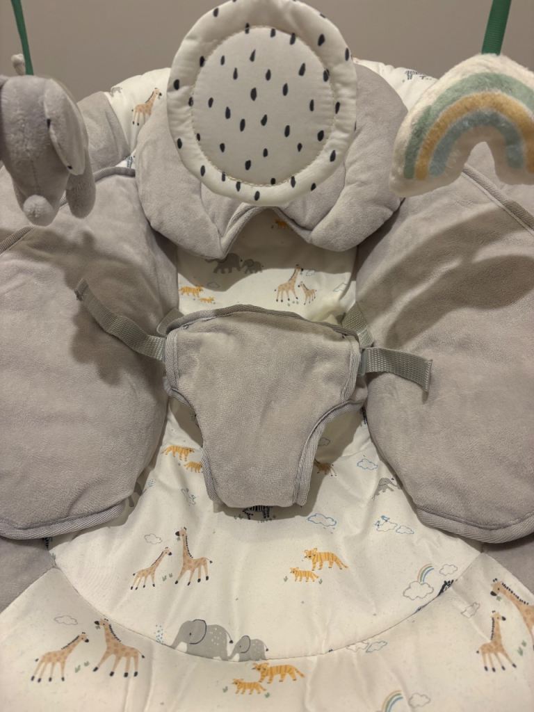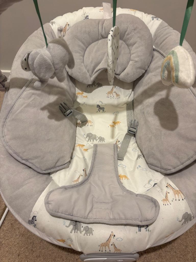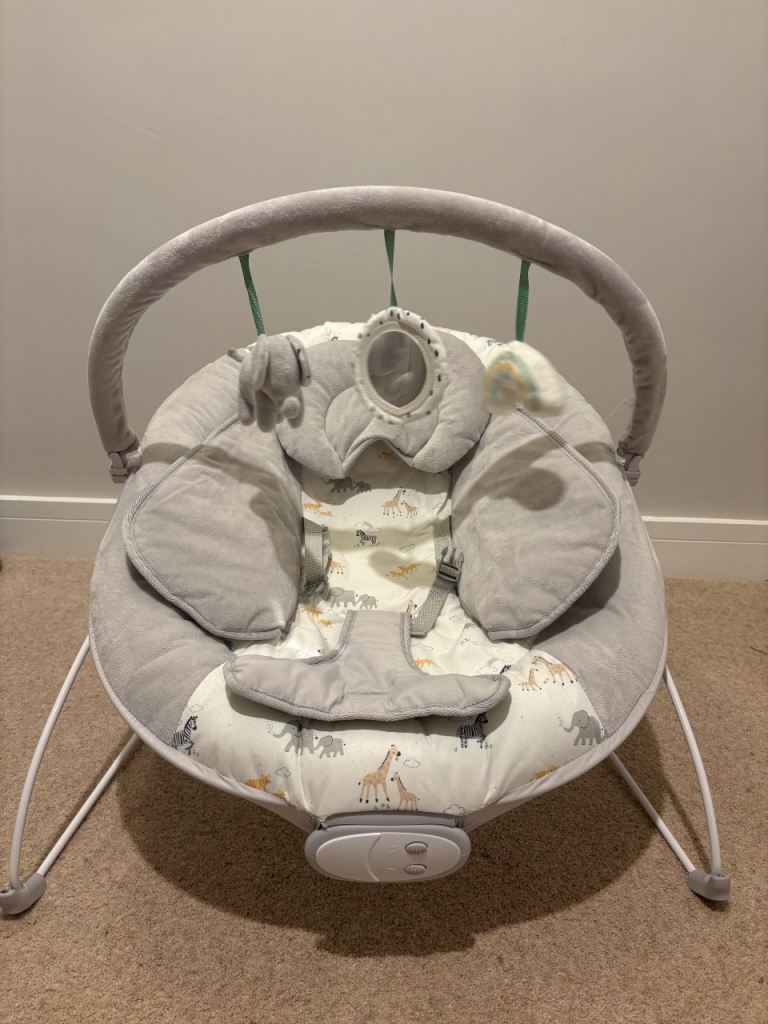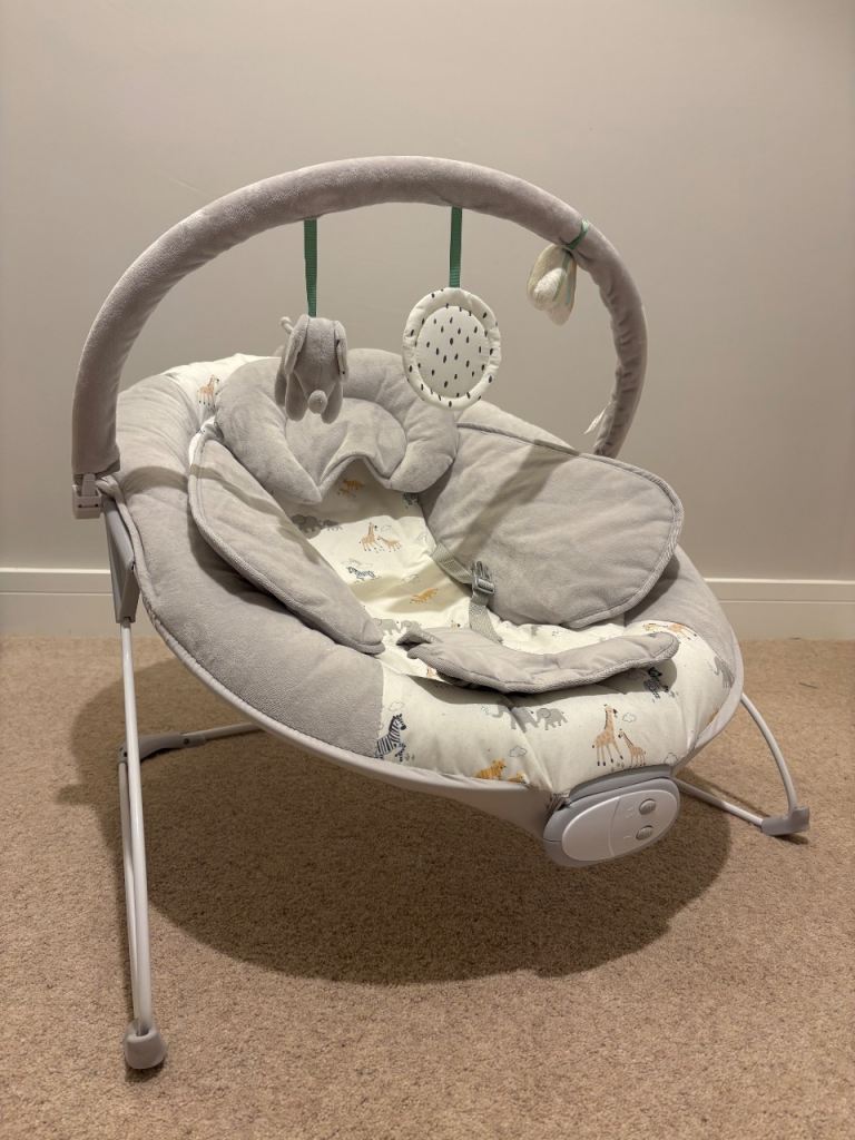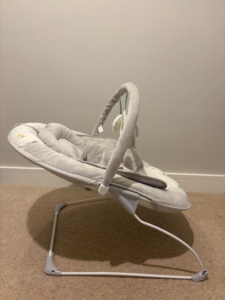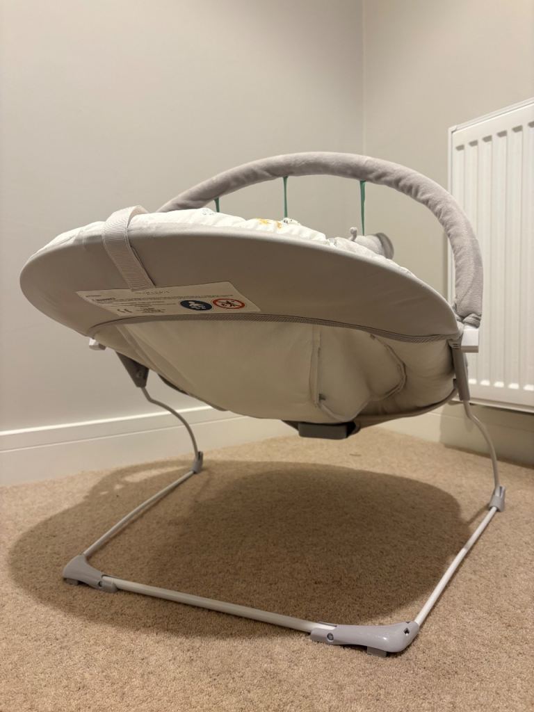 Electric Bay Bouncer from John Lewis featuring 3 vibration settings and continuous soothing music (volume adjustable). Barely used due to OLO not enjoying it. RRP £50. Gender natural colour.
