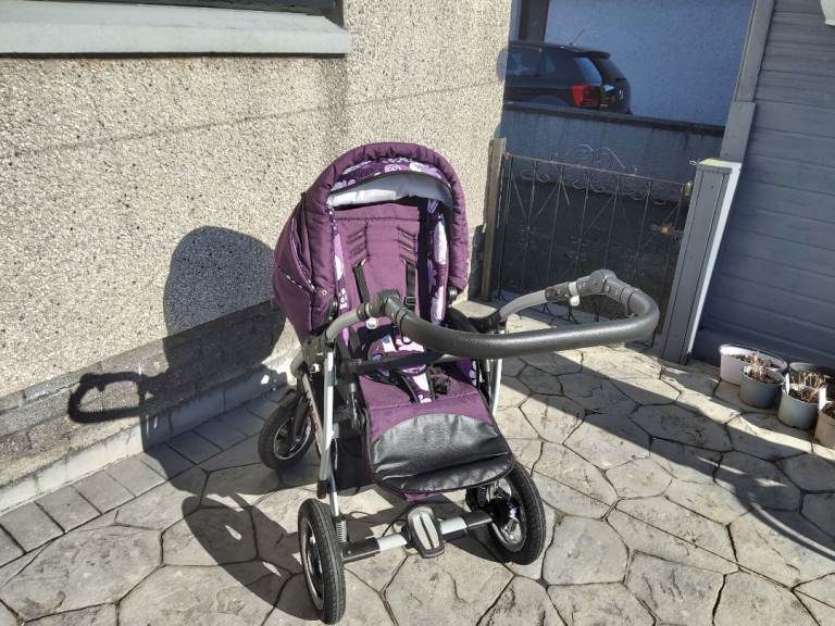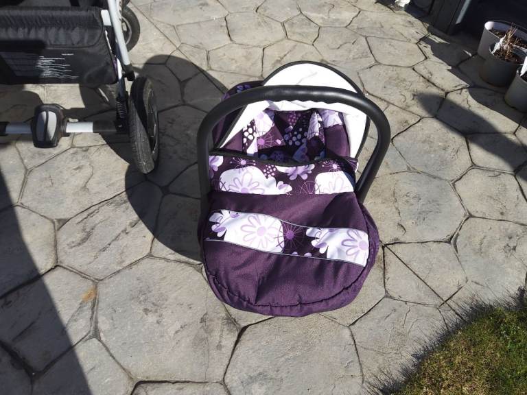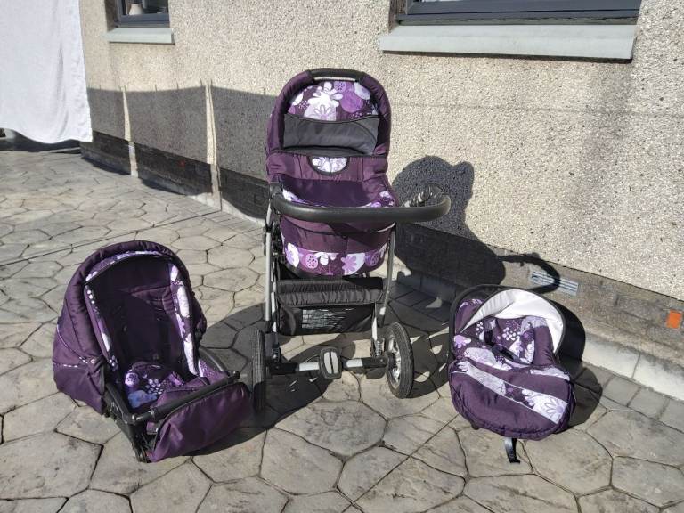 3 piece purple and white pram set in excellent condition. Includes, pram, car seat and pushchair. Raincovers are all included. Fits in the boot of a standard sized car. Easily changed from pram to pushchair.