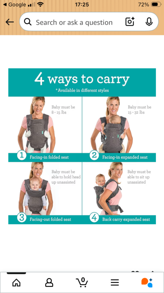 This carrier offers 4 ways to carry, suitable for babies from 8-32 lbs.