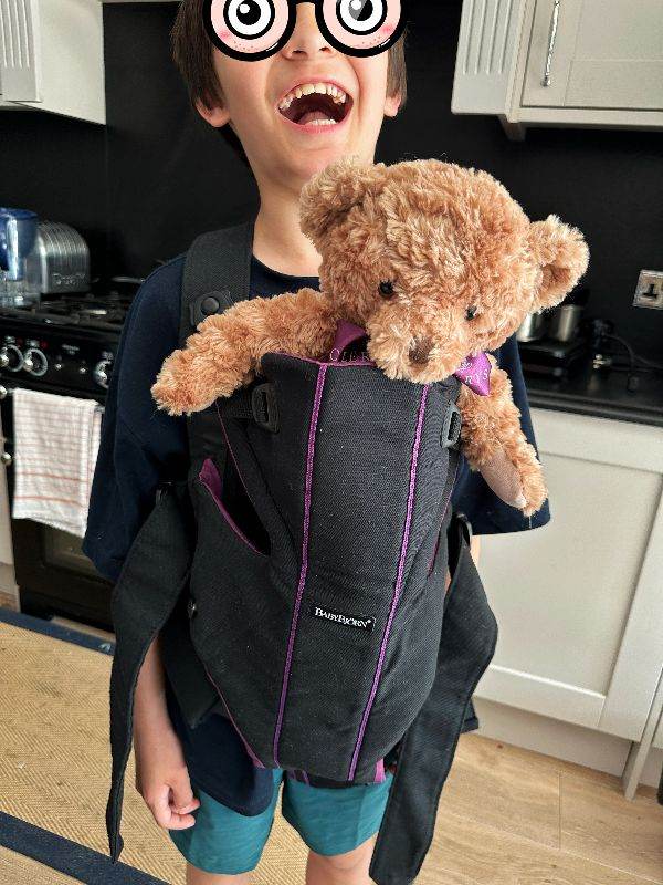 There are only the faintest marks on the reverse lining, clearly shown in the photo; otherwise it’s immaculate. And yes — the enthusiastic model in the photo is my son, proudly carrying his teddy and laughing like there’s no tomorrow.