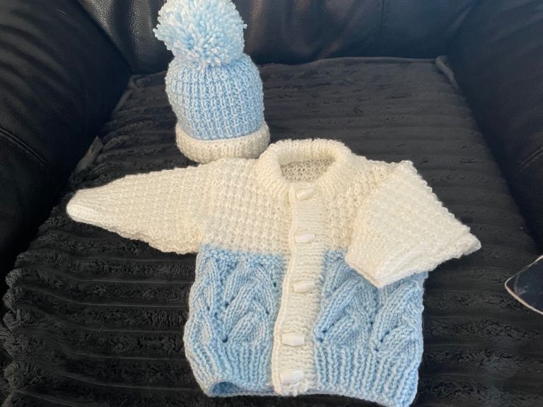 lovely hand knitted aran cardigan and hat 0-3 mths from smoke free home pick up DD2 area or can be posted