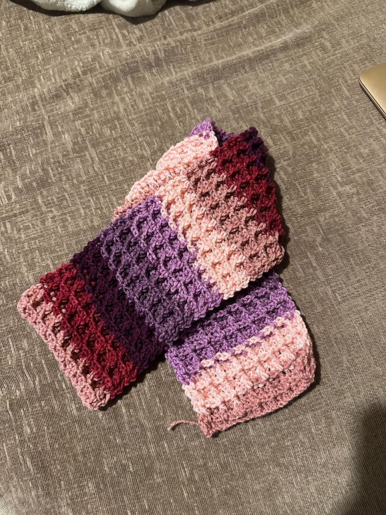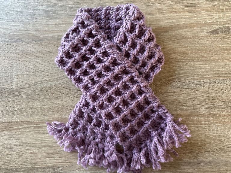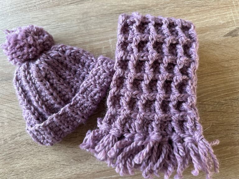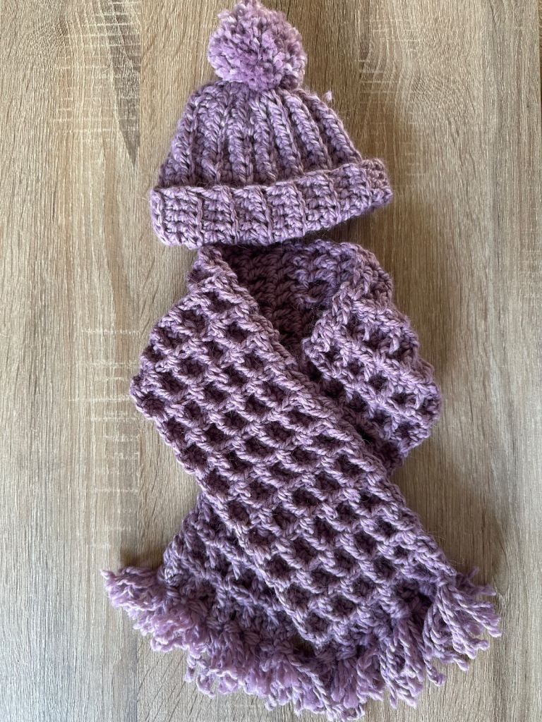 This beautiful handmade baby girls waffle stitch scarf and hat is perfect for keeping your little on warm and cosy. Made with super soft baby safe wool.