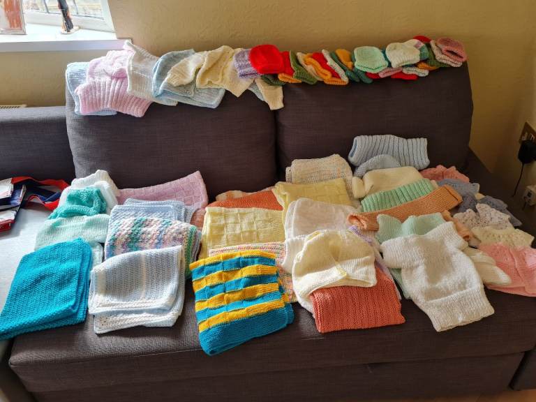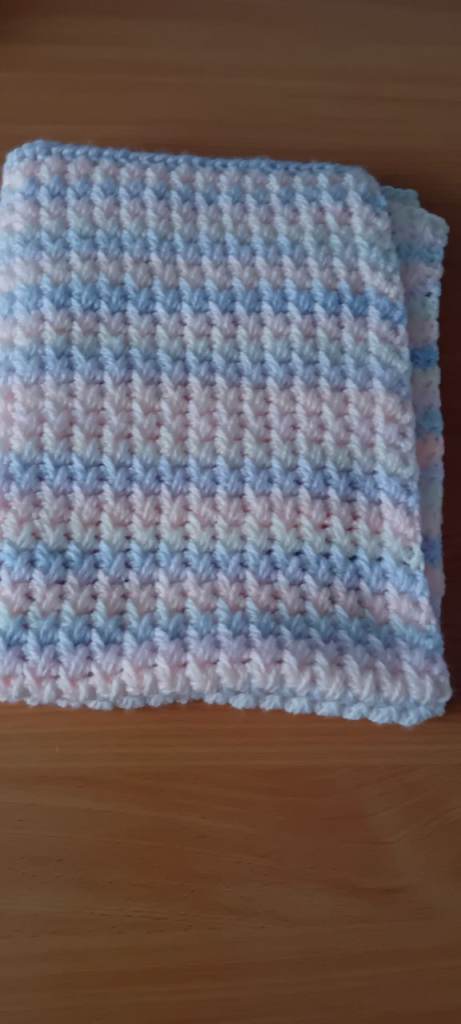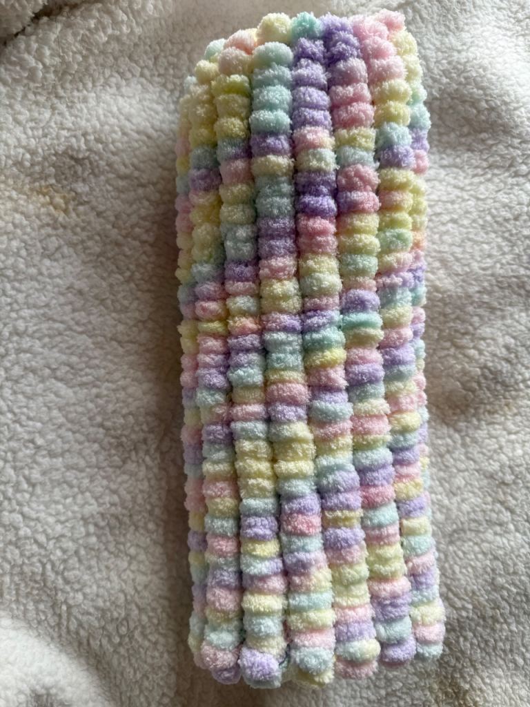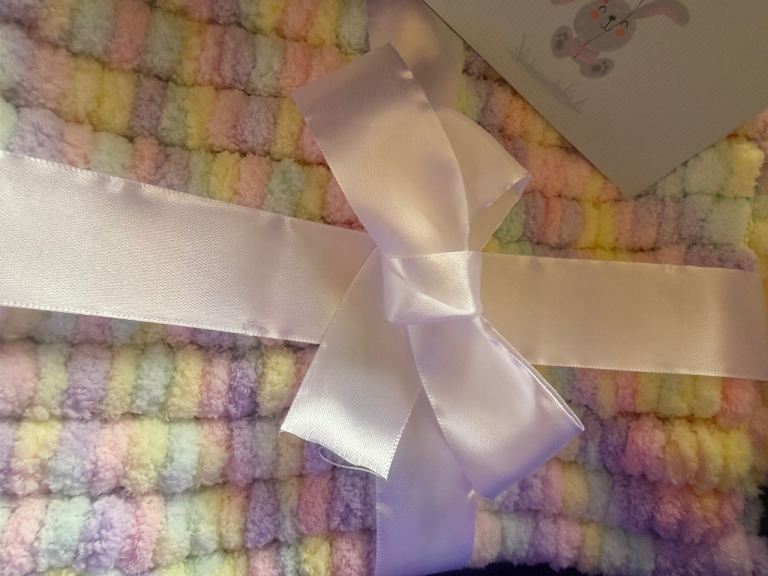 Beautiful Pom pom car seat blanket , comes boxed with a card girl/boy , hand knitted with love 💞