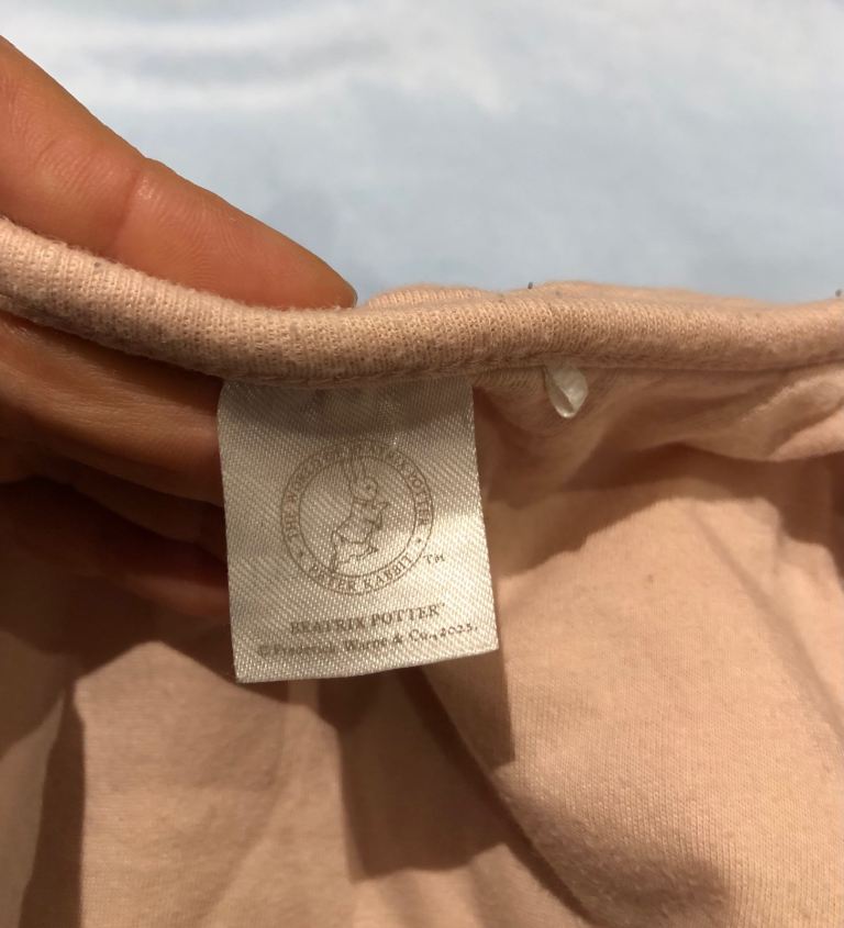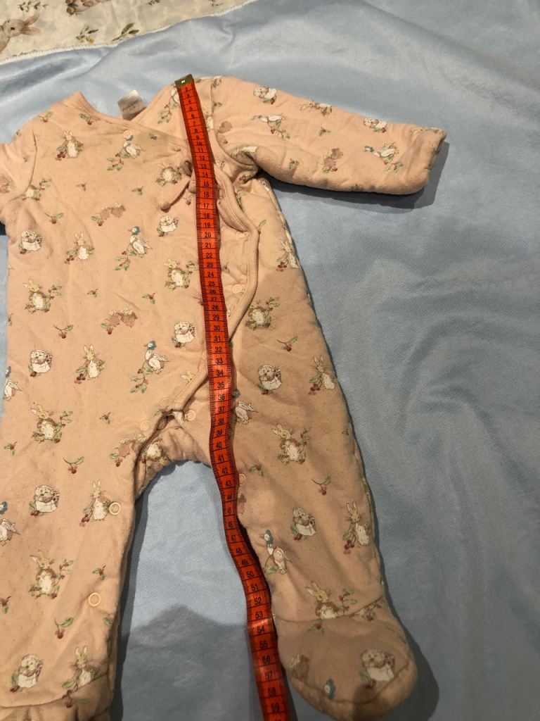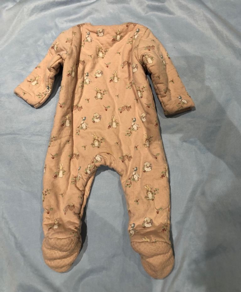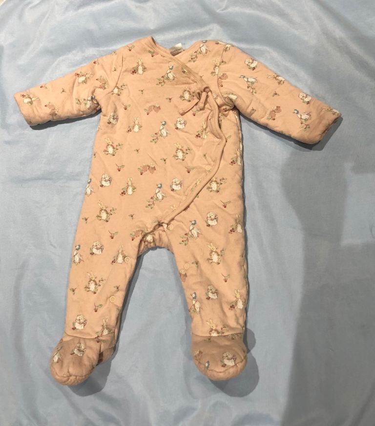 This Bodysuit set for 3-6 months old girls features a cute Peter Rabbit design in a peach colour. Made from soft cotton material, this one piece bodysuit style offers a comfortable and secure fit for your baby, perfect for everyday wear or special occasions. It was worn few times but it is in very good condition.