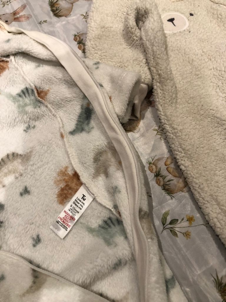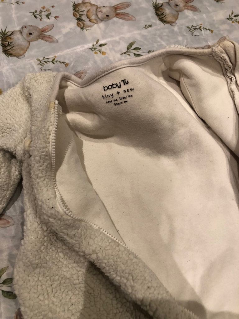 These are two bodysuits in 6-9 months and 9-12 months sizes, perfect for daily wear. Made from 100% cotton and polyester with long sleeve design and zip closure, these bodysuits feature an animal pattern in white and berblue colours. These two bodysuits are worn but still in good condition.