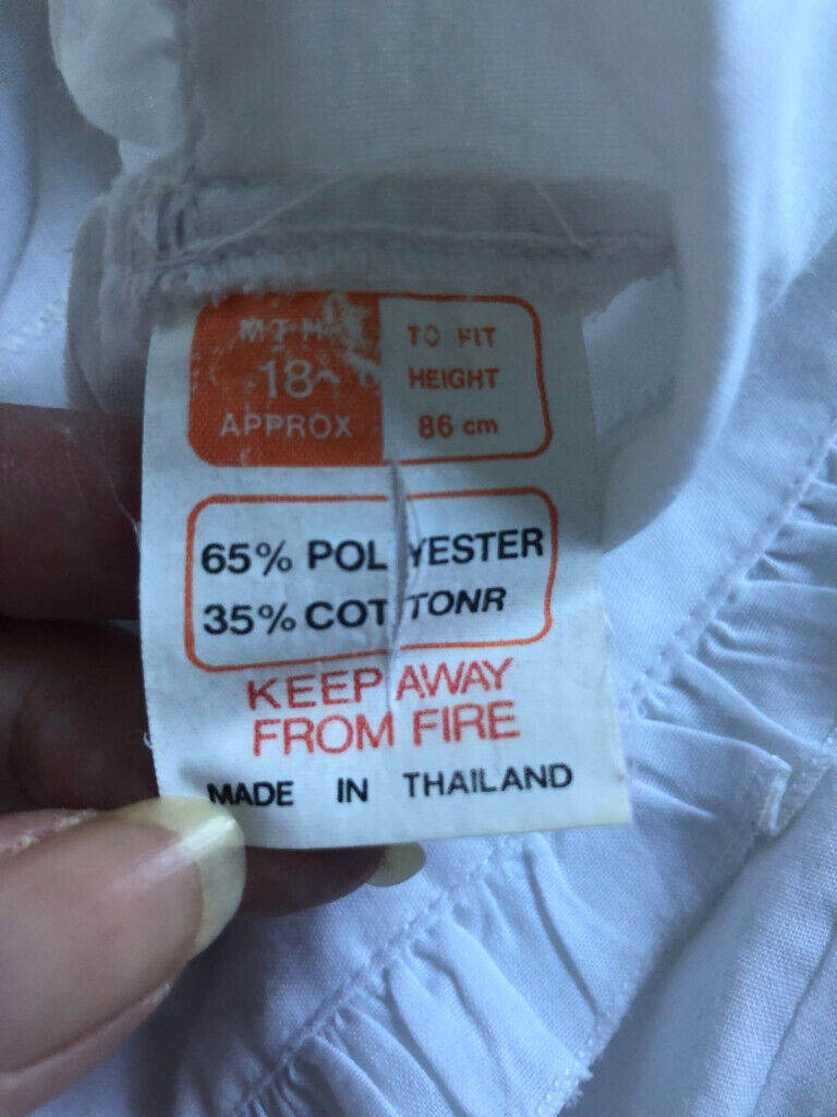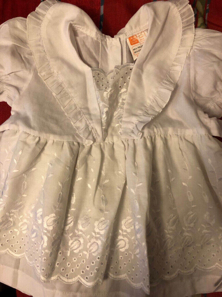 New baby dress with embroidery. Size - approx. 18 months. To fit height 86 cm. 65 per cent polyester and 35 per cent cotton. The size label has a small tear as seen in the image..