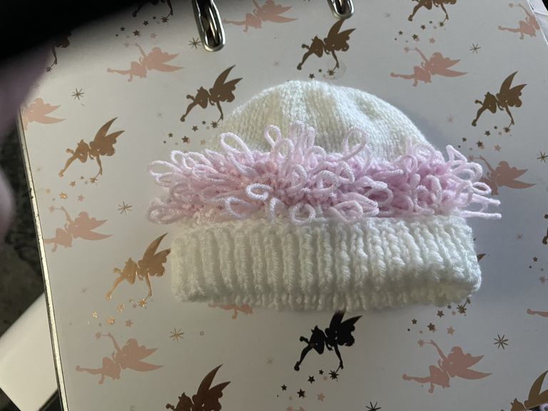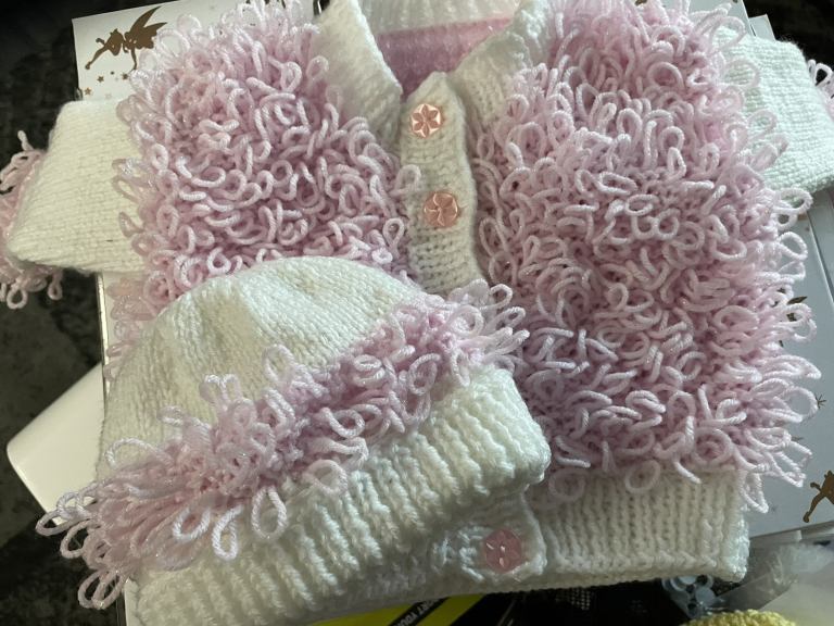 hand knitted loopy cardigan and hat 0-3 mths from smoke free home pick up DD2 area