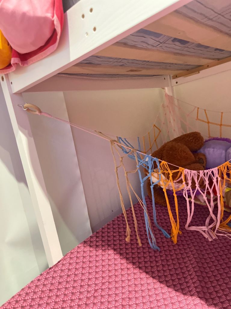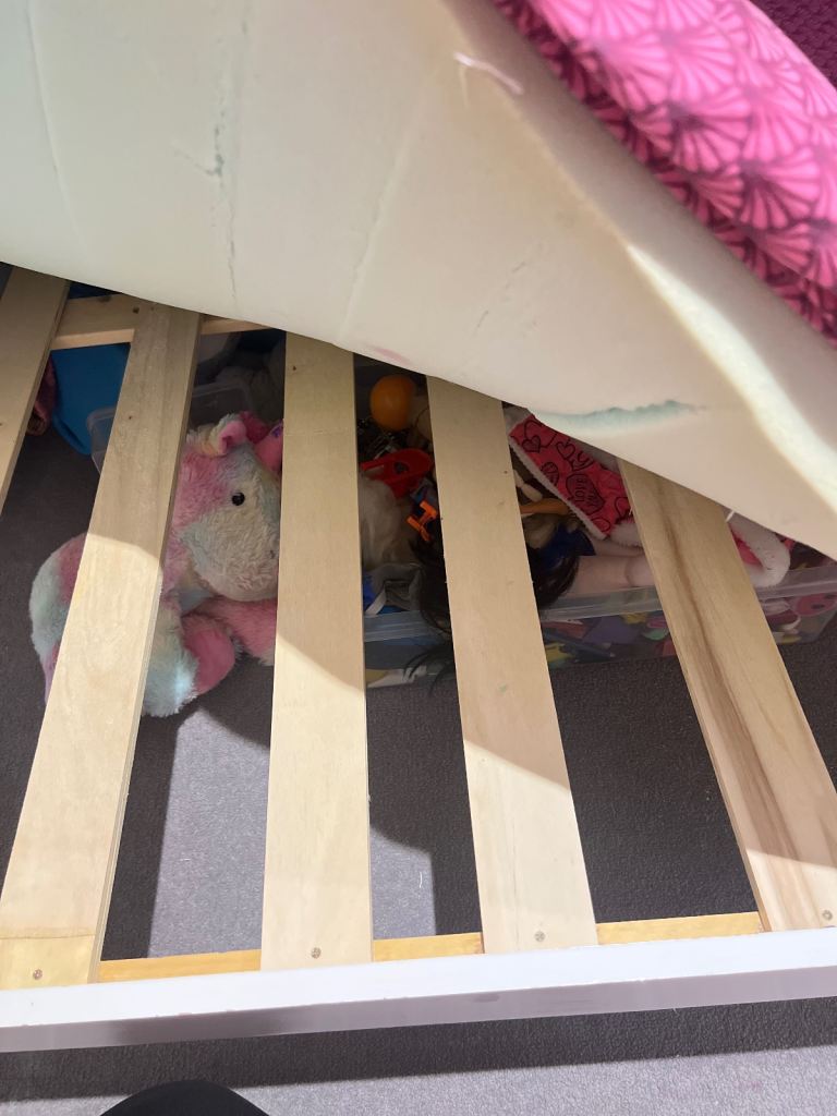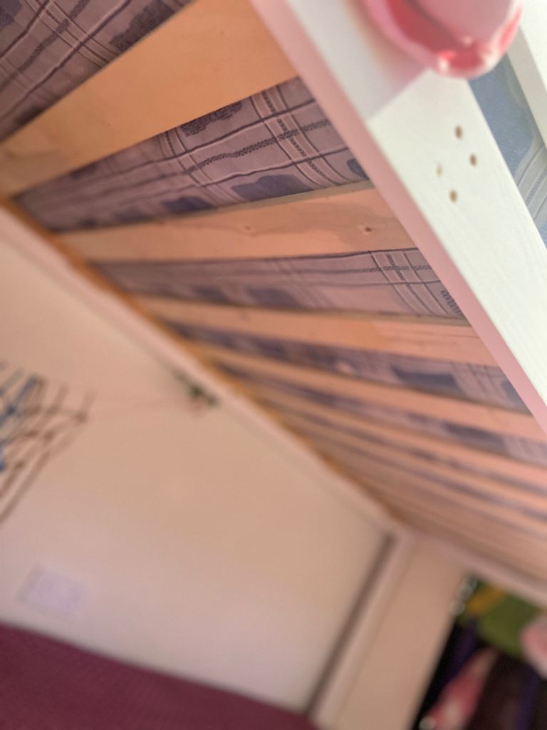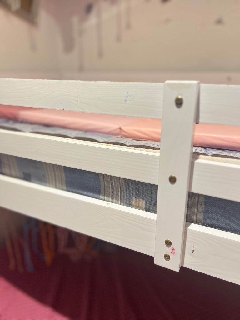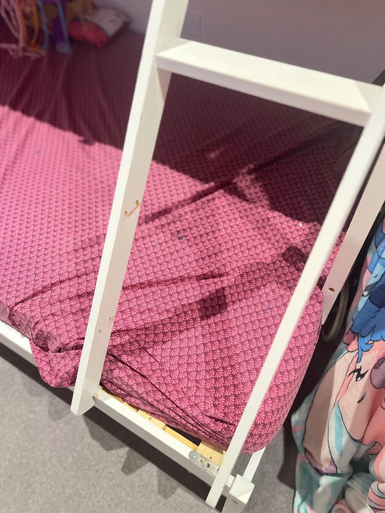 The bed features a built-in ladder for easy access to the top bunk. Ladder needs replacing