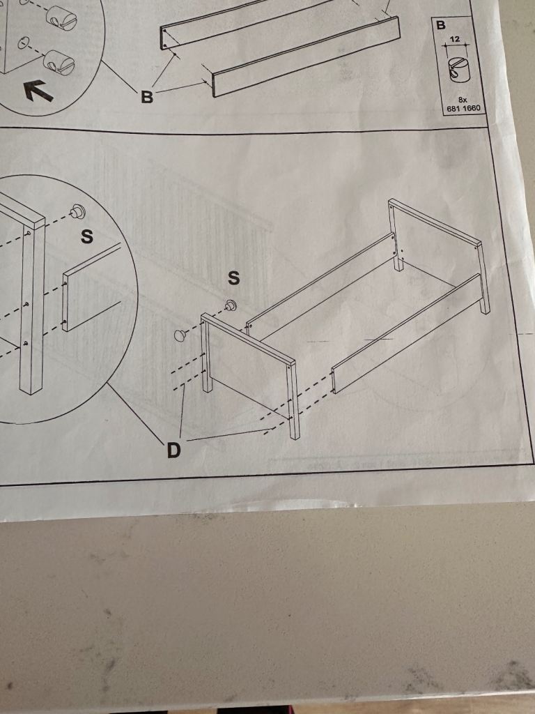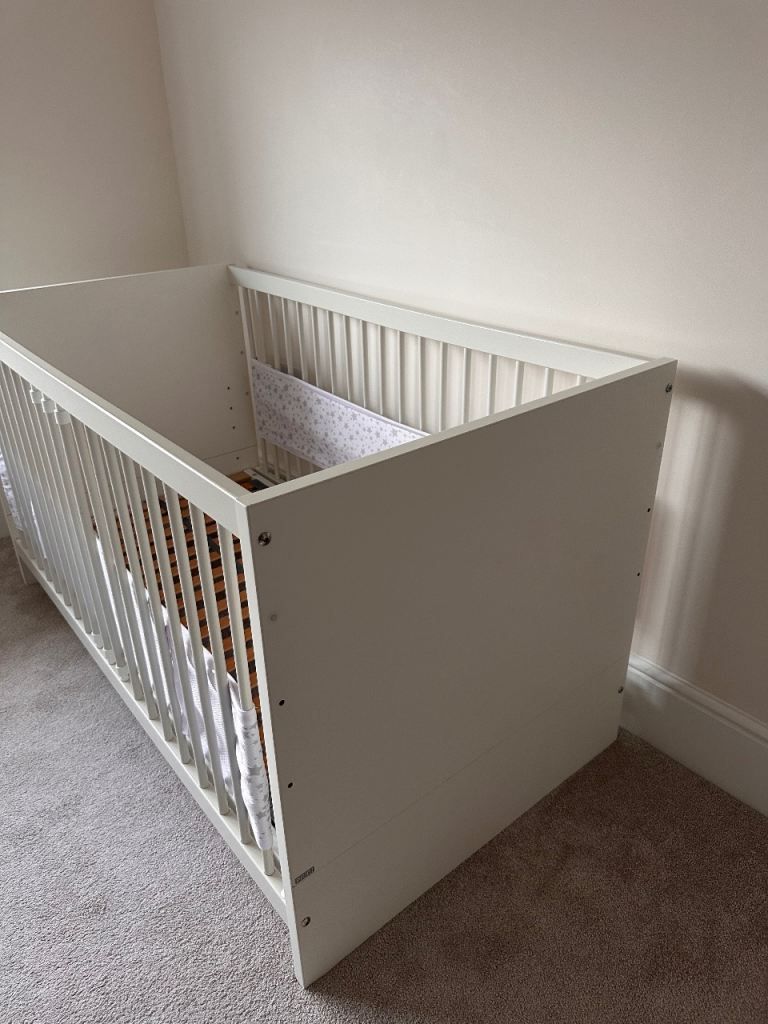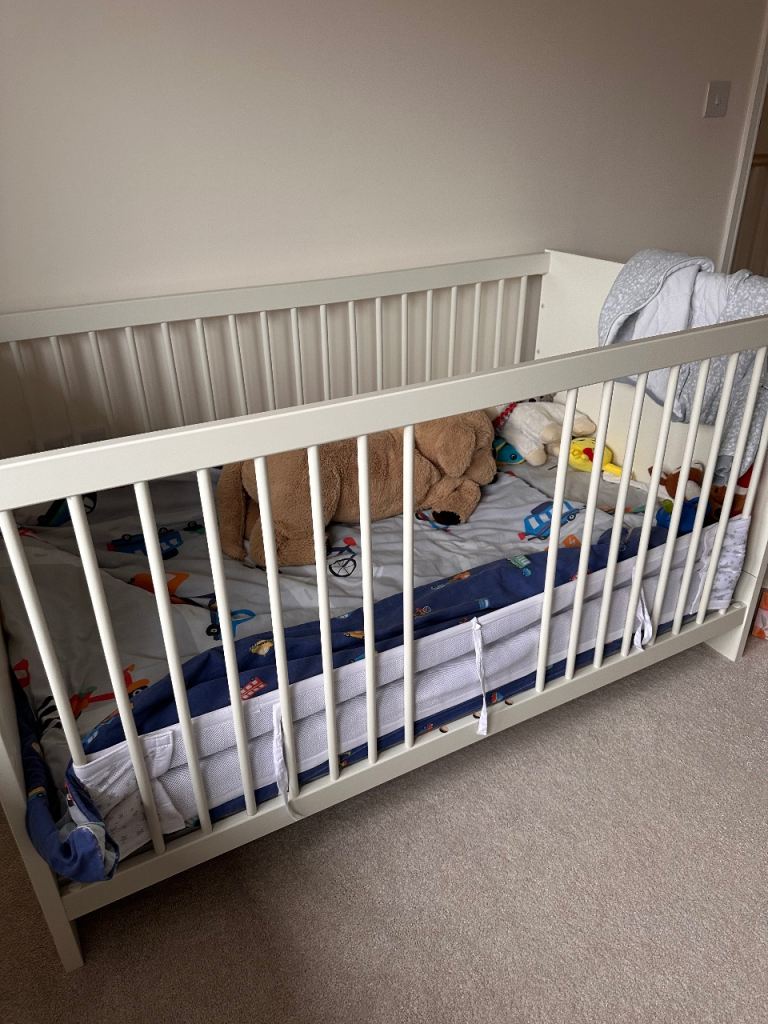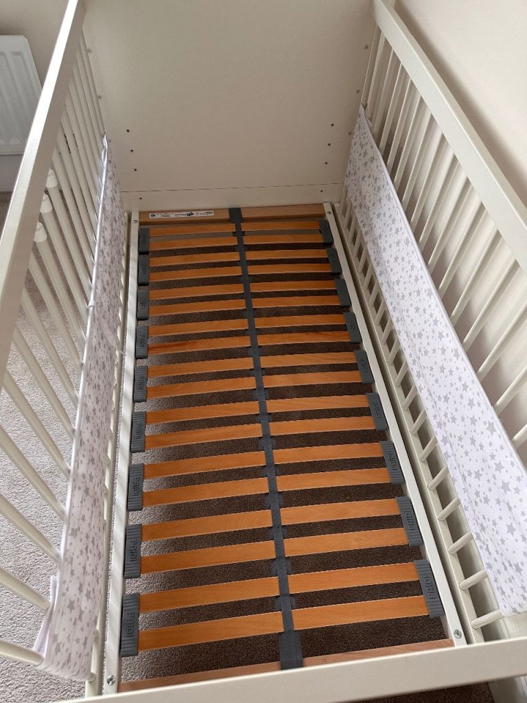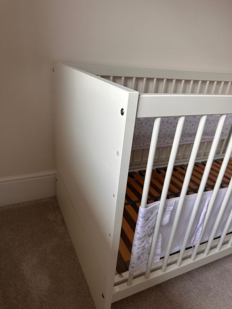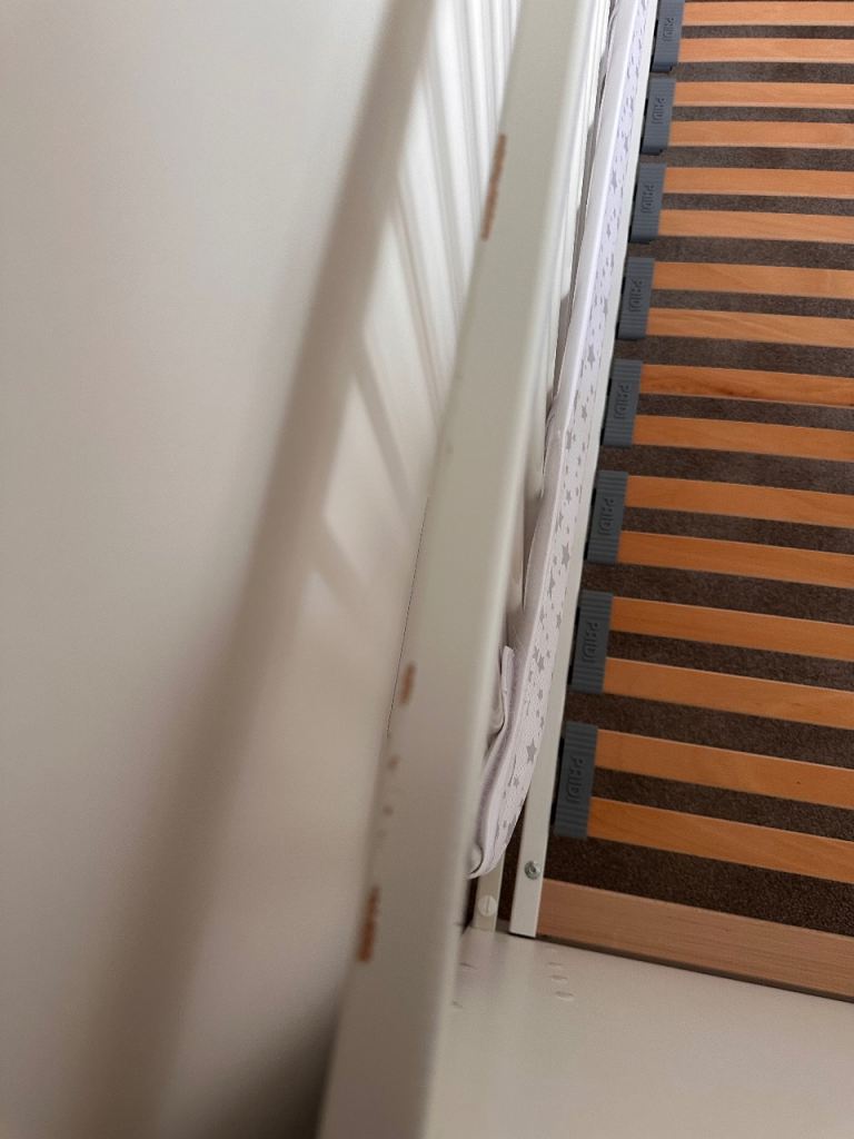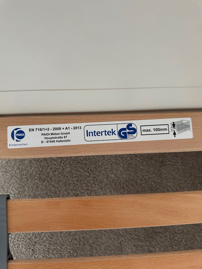 Paidi cotbed with three mattress heights. Some damage on the outside top bar, as seen in photo. Overall, in good condition. Three of the side bars come off to allow toddler to climb in and out independently before changing to toddler bed.