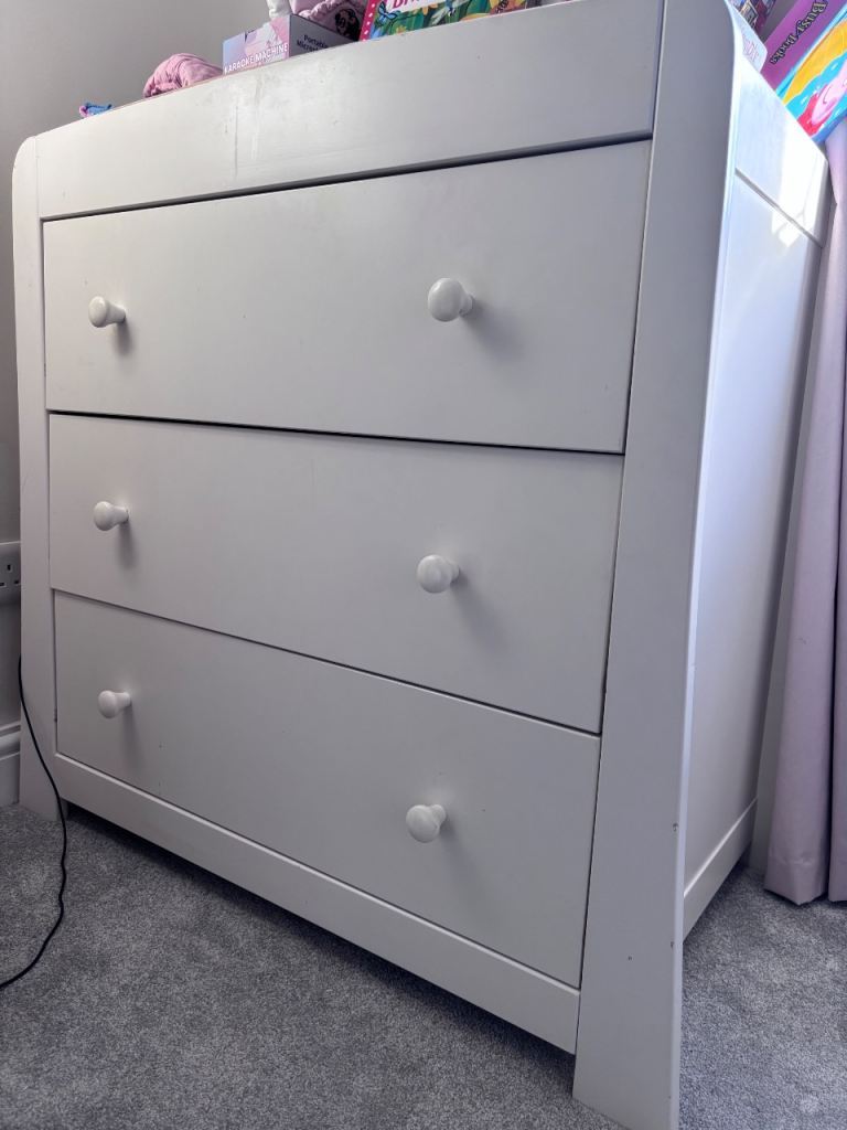 This set was purchased from mamas and papas and features a sleigh bed, chest of draws and wardrobe. The bed comes with cot sides (not pictured) and is suitable from birth. There is some wear on the drawers paint work but all is in great condition.