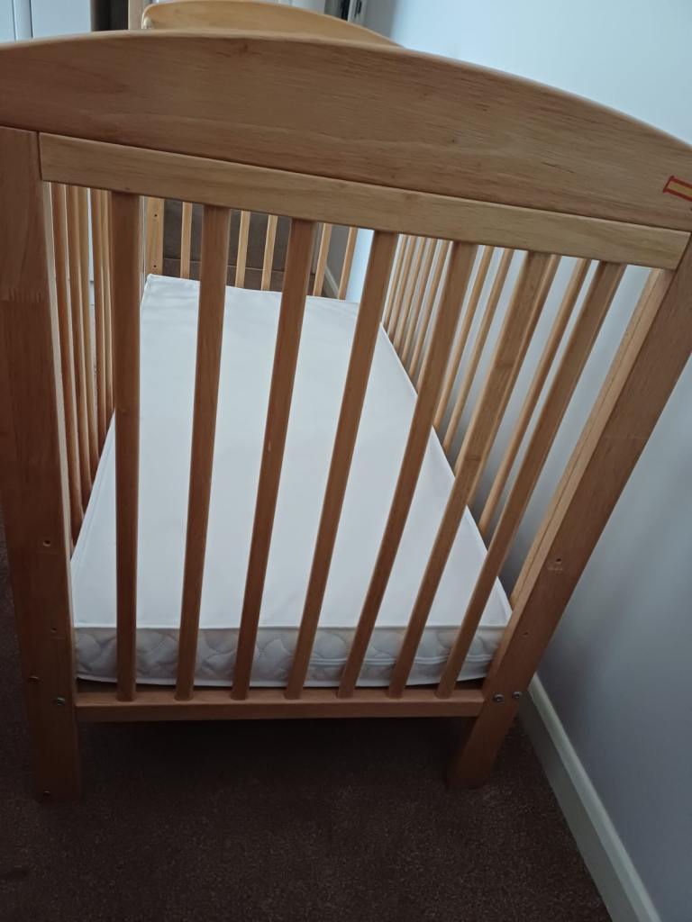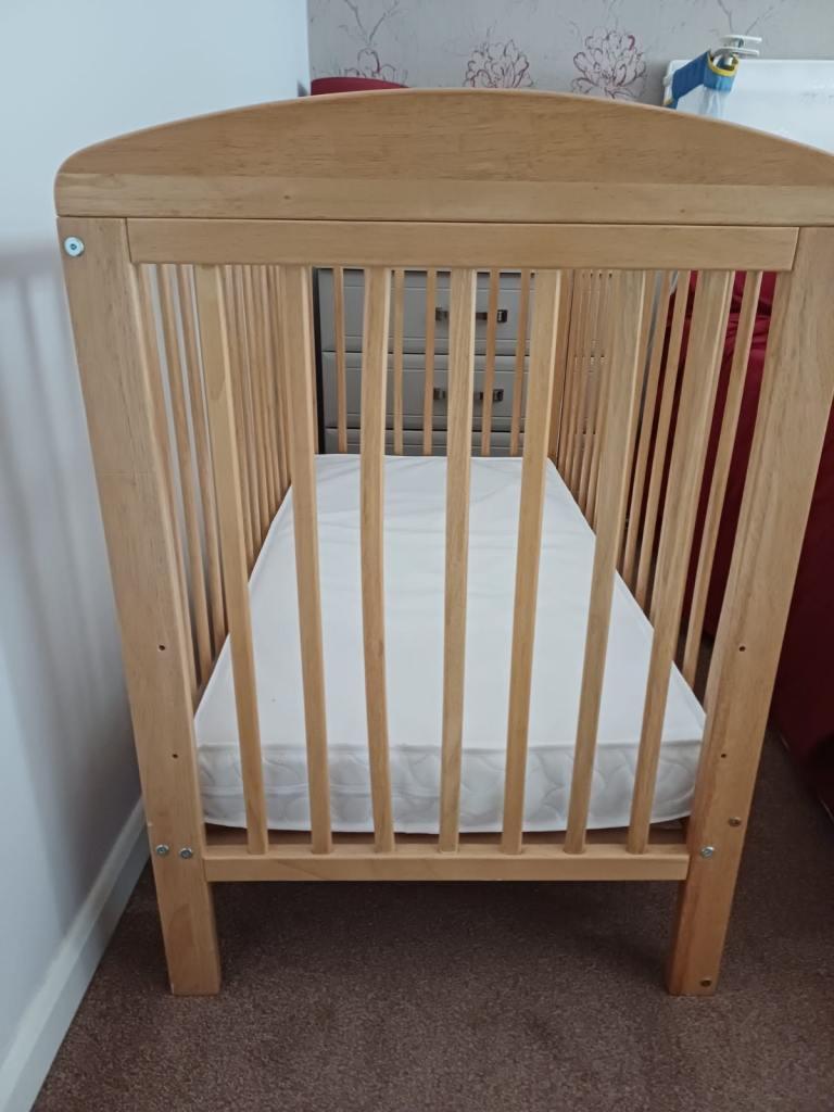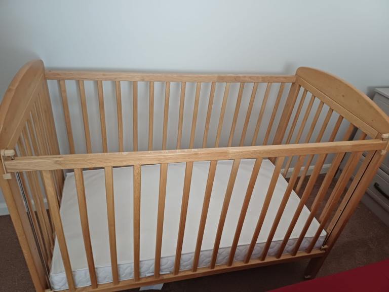 Excellent condition solid wood cot from mamas and papas. Mattress height is adjustable and the side wall lifts down and locks safely back in to place for ease of getting babe in and out of the cot.
