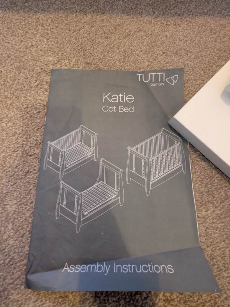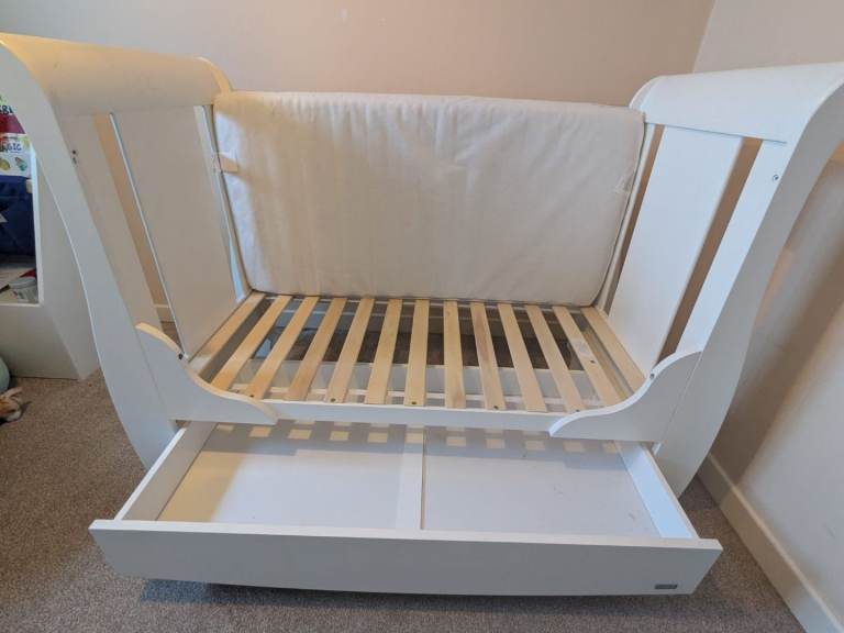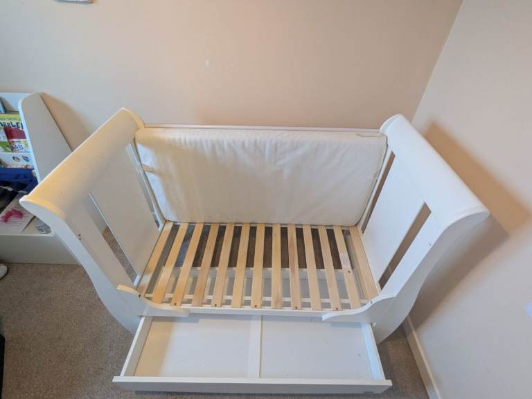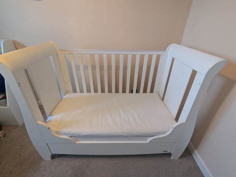 Beautiful Tutti Bambini Katie Cot Bed in white. This is a premium, stylish piece of furniture made from solid New Zealand Pine, featuring a classic sleigh design.