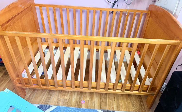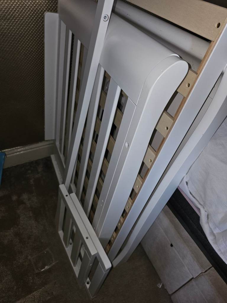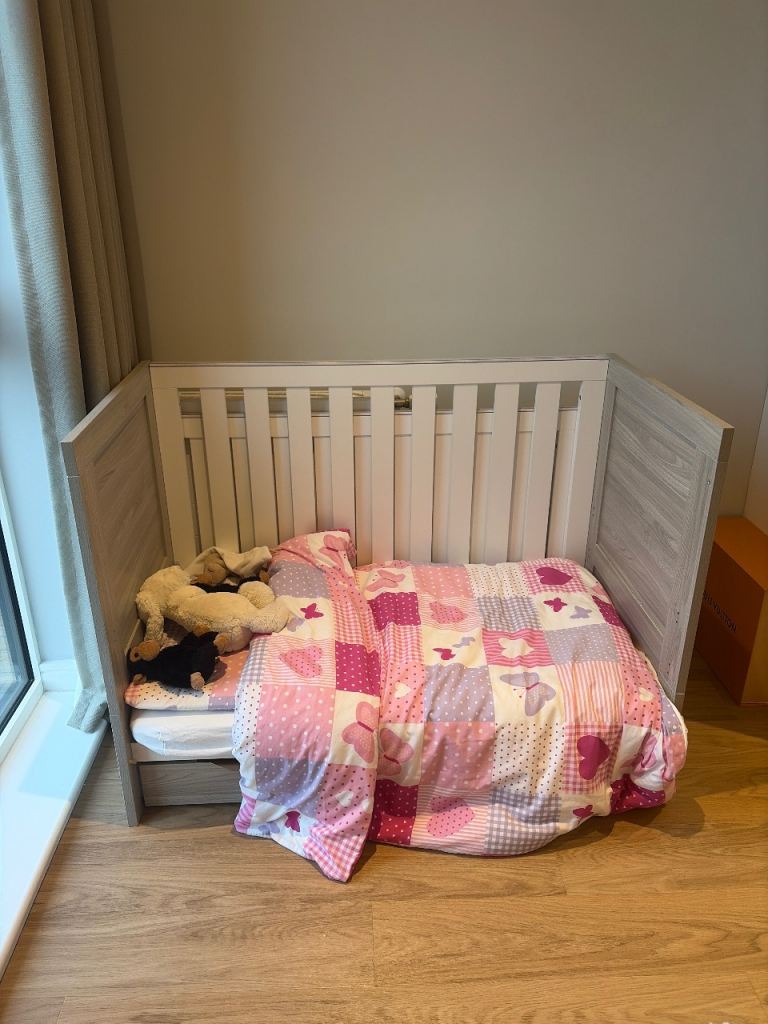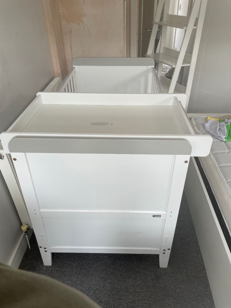 Cot turns into a toddler bed. Cot has barely been used and is like new except for a chip on the changing table and some marks as shown on the photos. It will need to be taken apart.