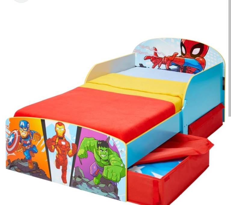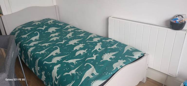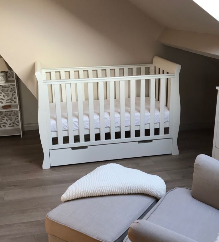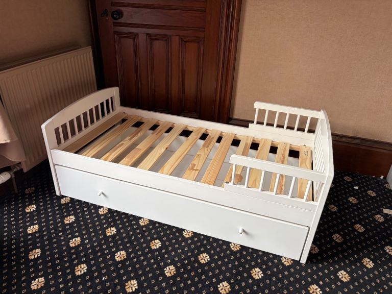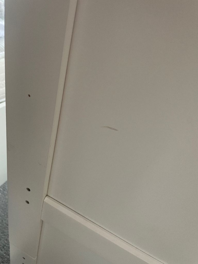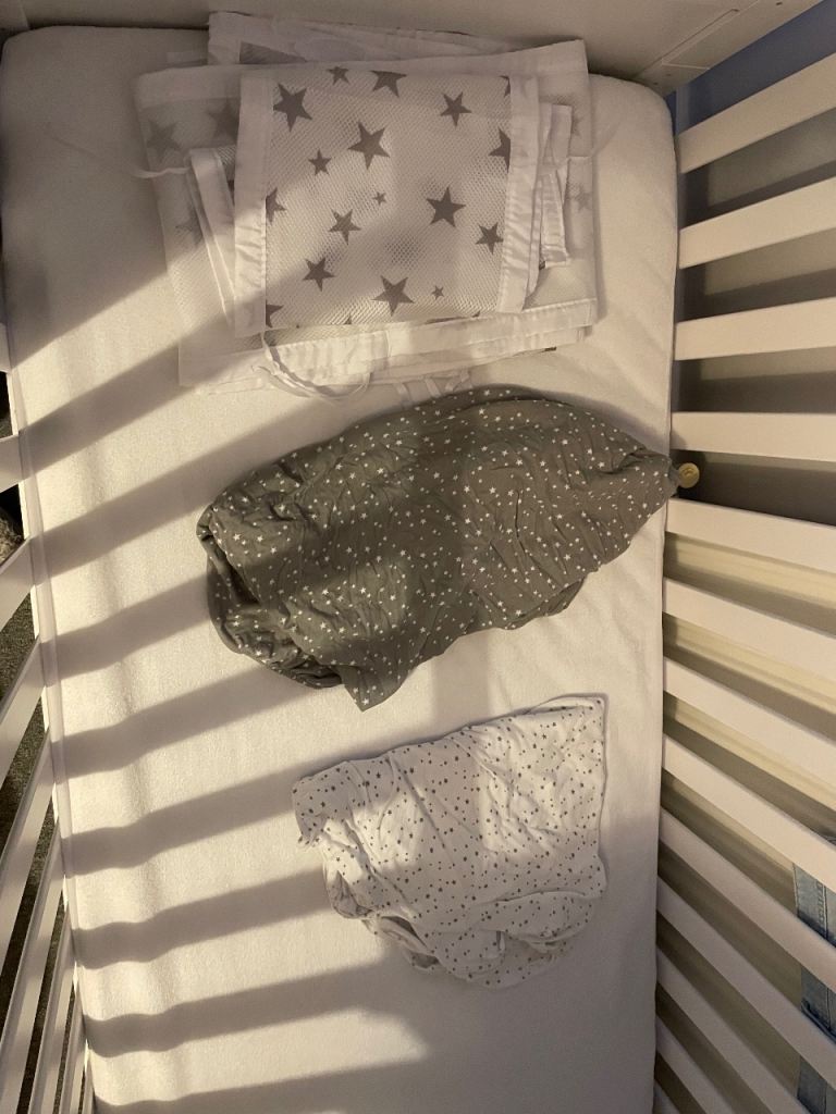 Cot turns into a toddler bed. Cot has barely been used and is like new except for a chip on the changing table and some marks as shown on the photos. It will need to be taken apart.