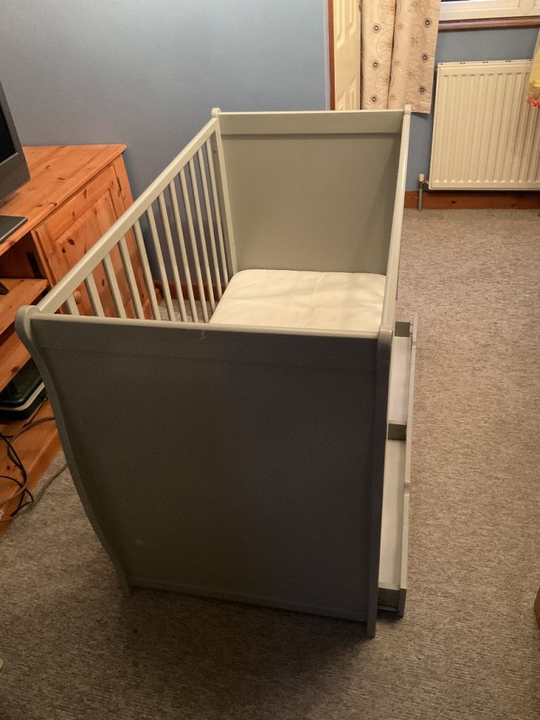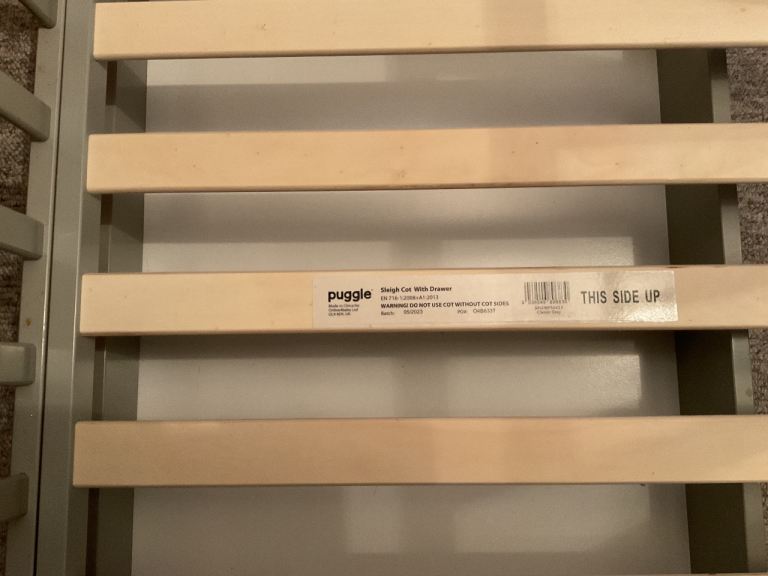 Puggle sleigh cot with drawer in good condition. Buyer collects.