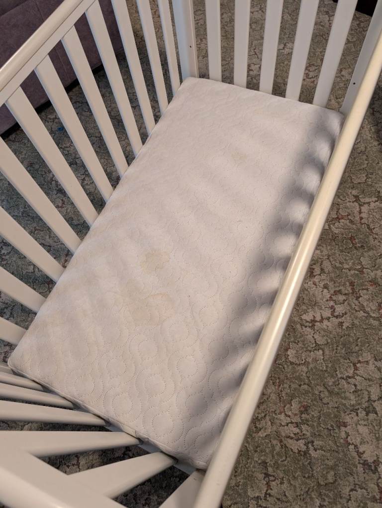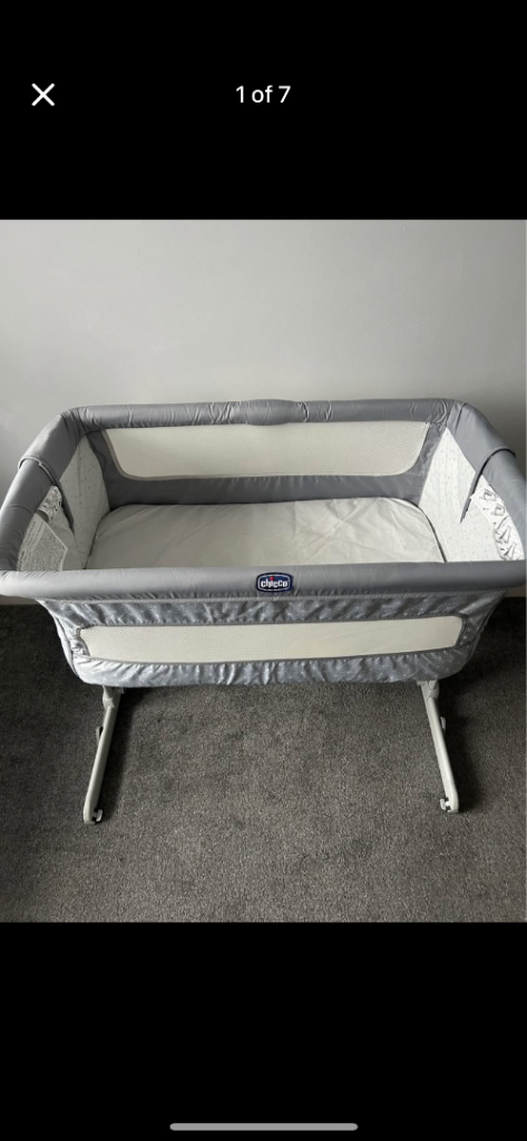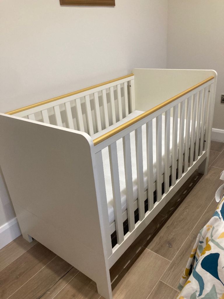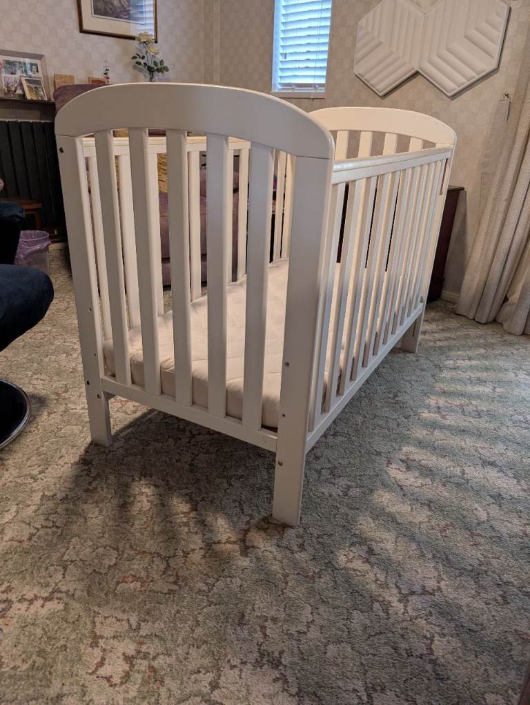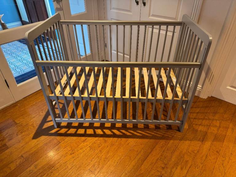 Hardly used cot. Bought by grandparents for when grandchildren stay over. Mattress slightly stained.