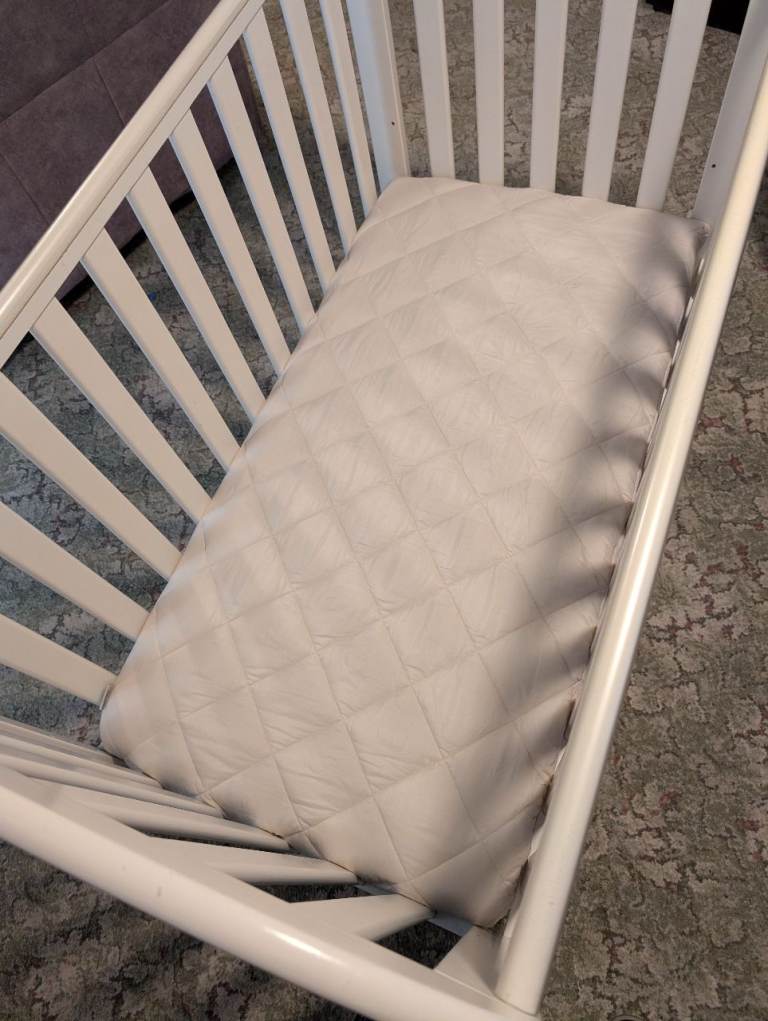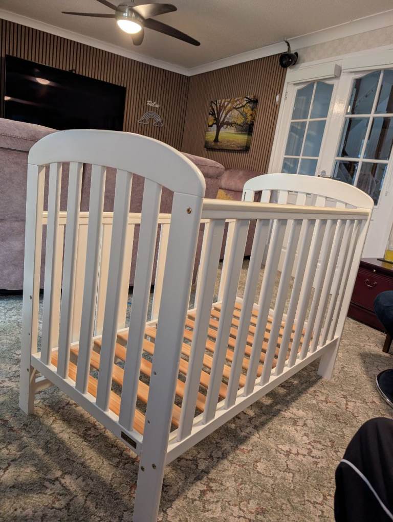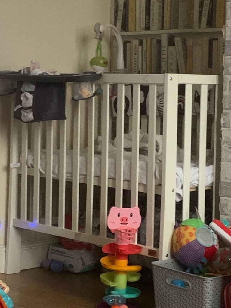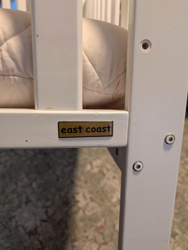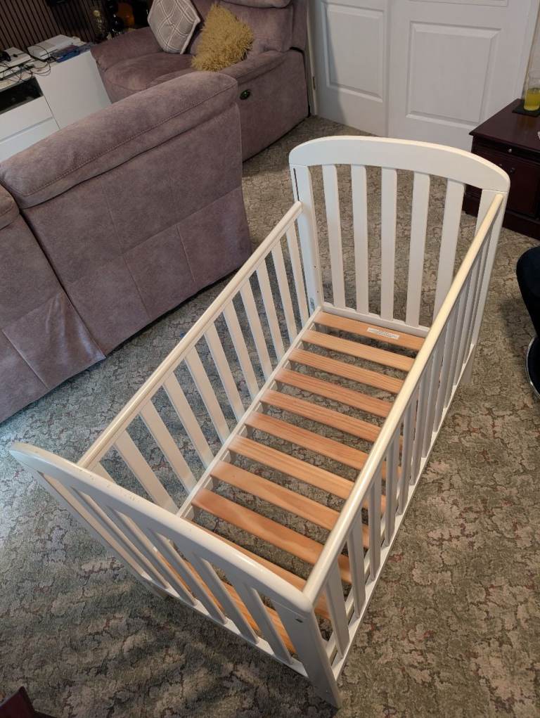 Hardly used cot. Bought by grandparents for when grandchildren stay over. Mattress slightly stained.