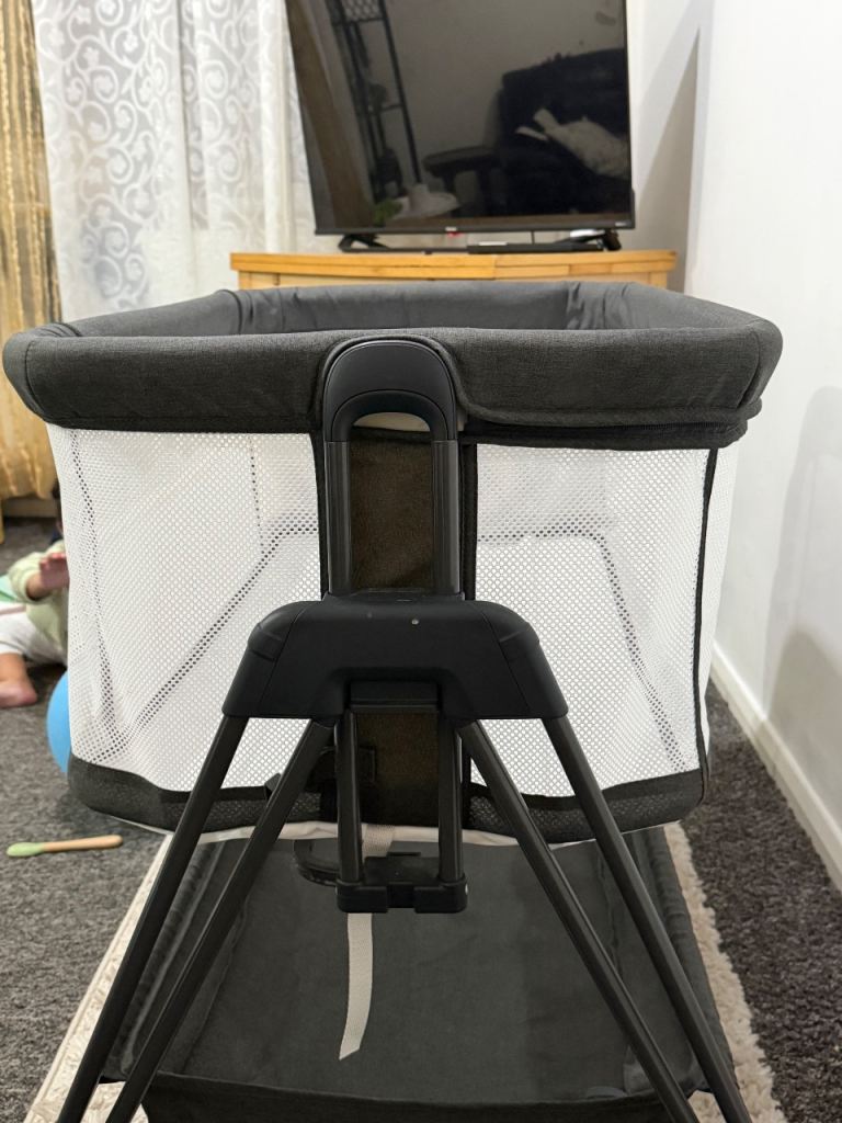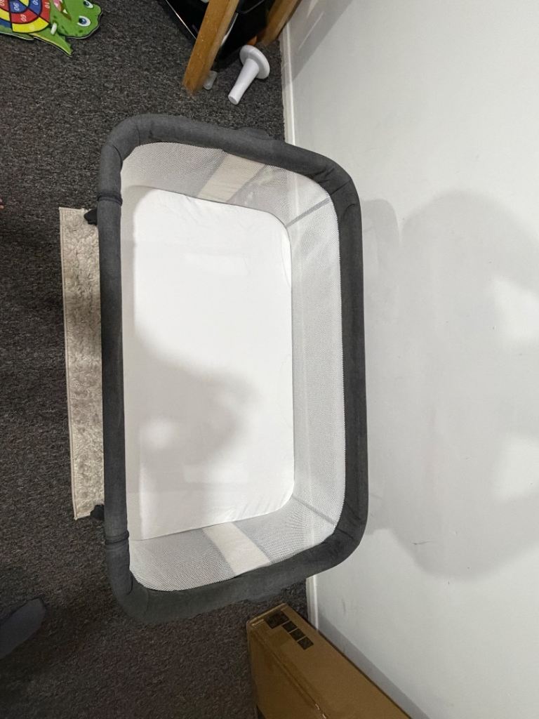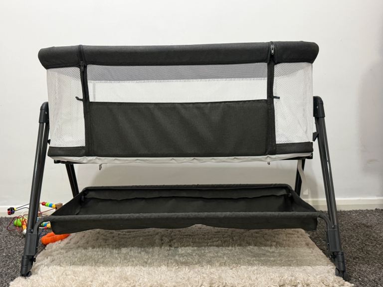This baby cot features an adjustable mattress height to match most bed levels and can be used securely next to your bed, making night feeds easier and more convenient. It has breathable mesh sides to allow airflow and clear visibility of your baby, along with a sturdy frame and stable legs for added safety. The neutral grey colour suits any nursery or bedroom décor. It is easy to assemble, lightweight to move, and ideal from the newborn stage onwards. Can be packaged for travels as well.