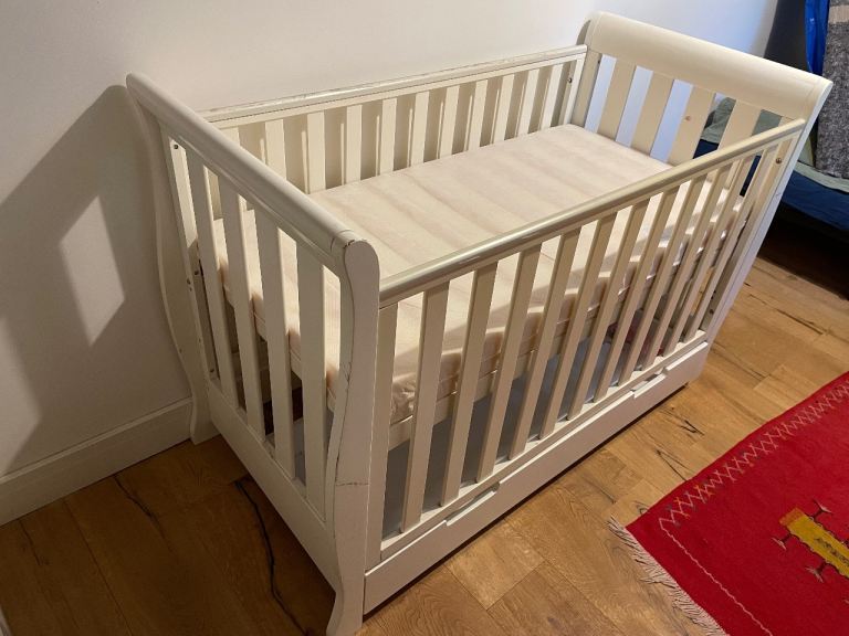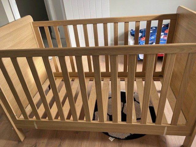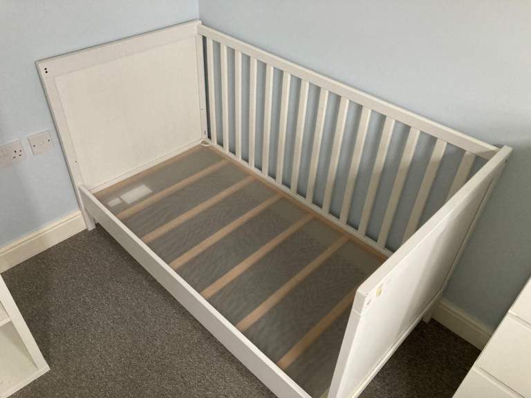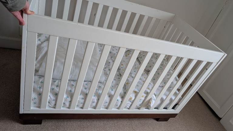 Side comes off to create a toddler bed. The bed comes with instructions on how to reassemble depending on age of baby.