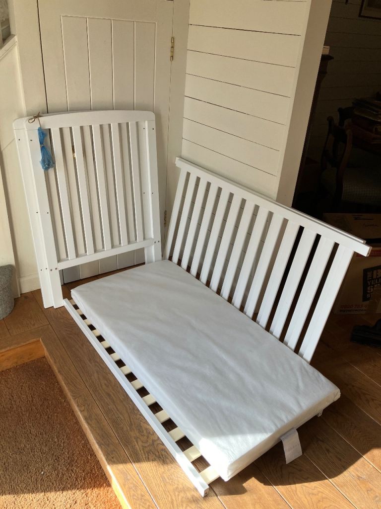 Easily assembled cot and mattress which has the fire resistant label in tact. Measures 120cm L x 60cm W x 12cm D.