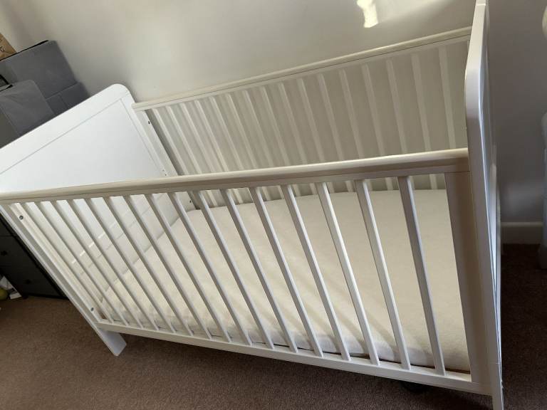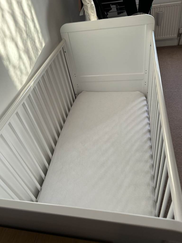John Lewis Wilton Cot Bed with mattress used some four times over the last four years. It is in excellent condition. It has three mattress base positions. It is dismantled for easy transport and assembly is fairly easy. Buyer to collect.