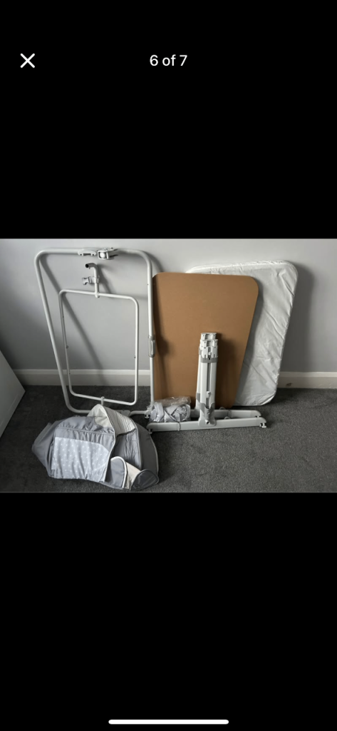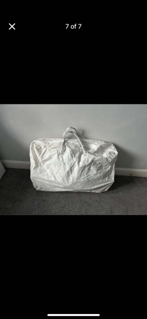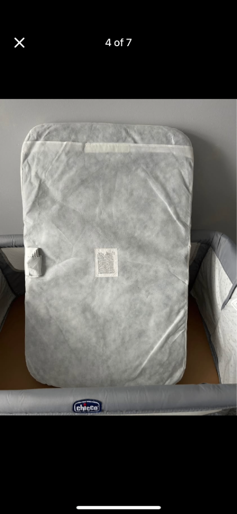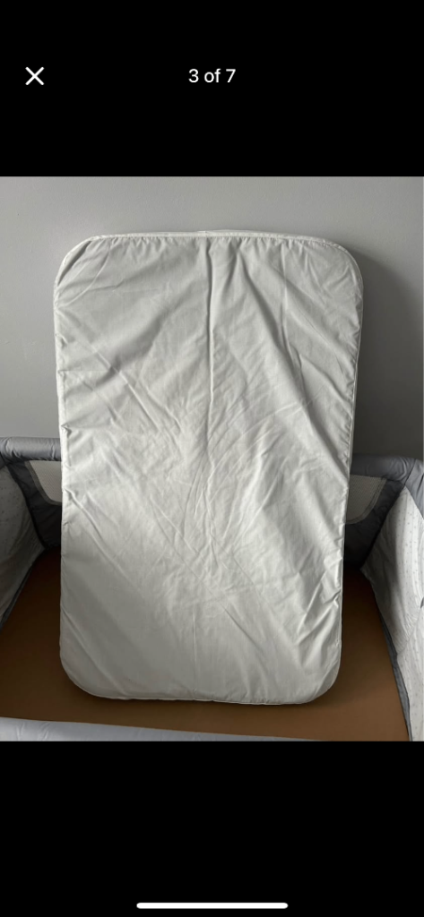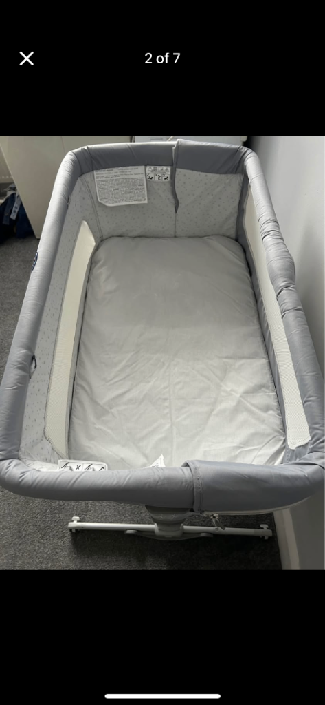Next to Me Baby Cot. Comes with a bag holder to pack away into. In good condition. A stain( milk sick) on mattress as can see in picture but don’t affect use.