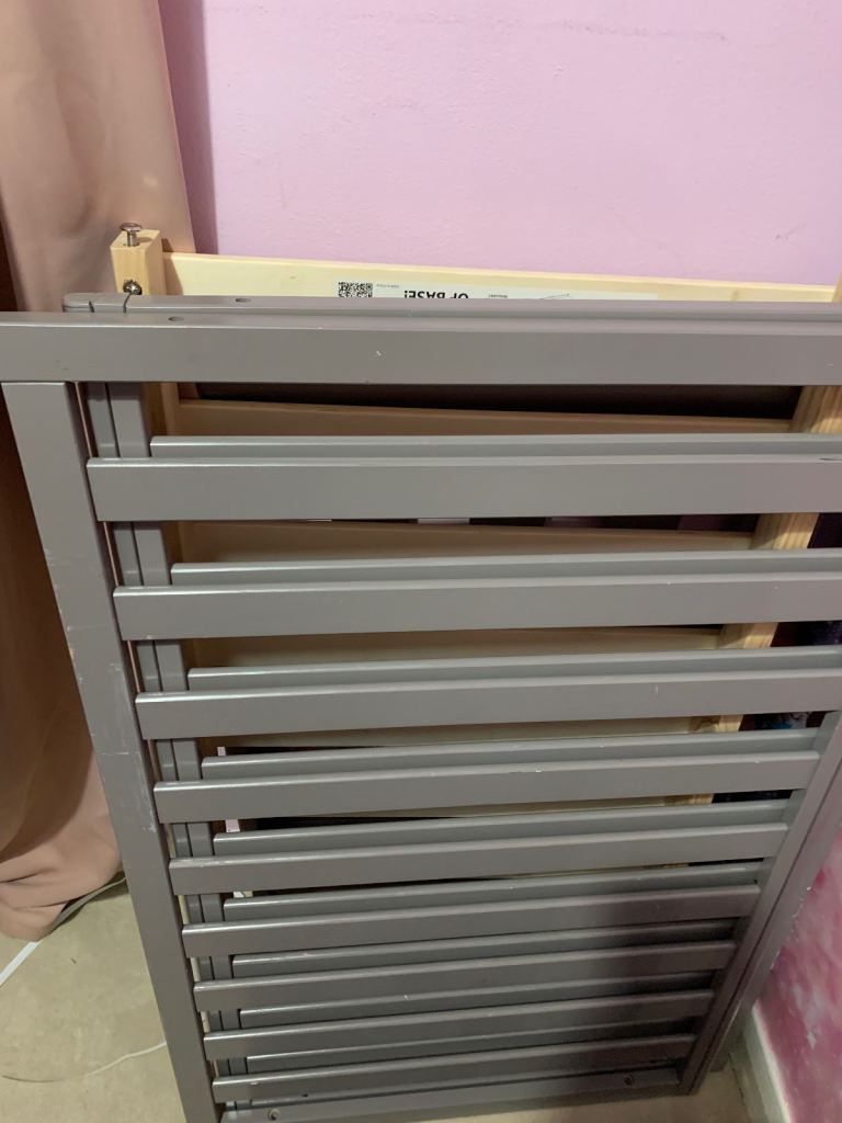 Obaby slamford space saver cot as u can see on photos the wood has chipped a little bit doesnt affect use can be used as a normal cot as sides comes off comes with mobile cot no matress requires matress of 100x50cm 10cm thick grey colour is adjustable for high so low medium and high setting is dismateled ready to go collection only can send more photos if u inbox me will accept offers