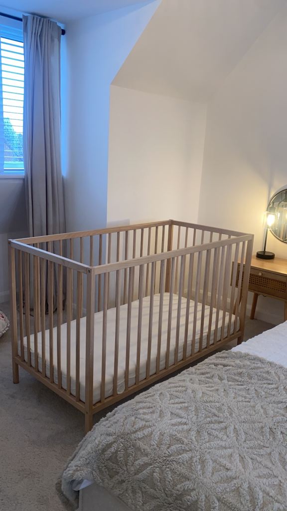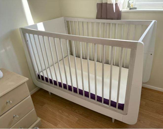 REDUCED!Snüzkot Skandi Cotbed+mattress-fitted sheet, Toddler Rails + new feet pack for the cot