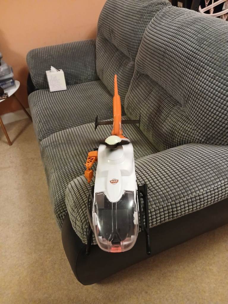 Orange and white toy helicopter with 'Air Rescue' branding.