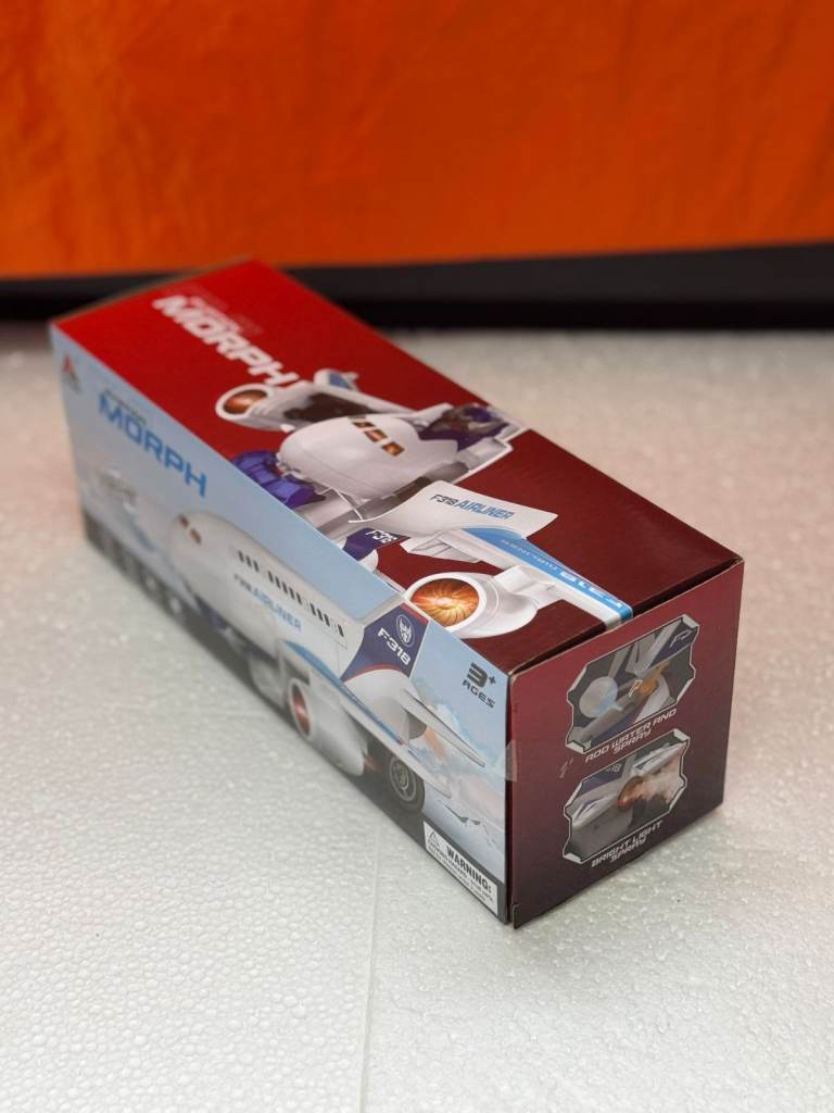 Fun Aviation Morph transforming airliner toy that automatically converts from aircraft to robot for exciting, action‑packed play. Features light‑up effects, sound functions and motion for added engagement. Designed with a bold F318 airliner look and a dynamic robot mode that kids love. Suitable for ages 3+, with a clear safety warning regarding small parts. A great gift for children who enjoy vehicles, robots and imaginative play.