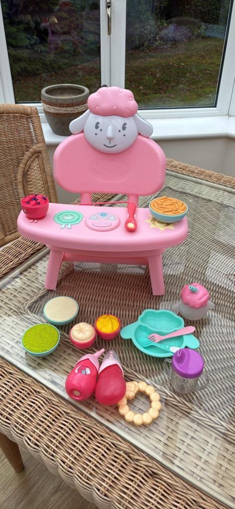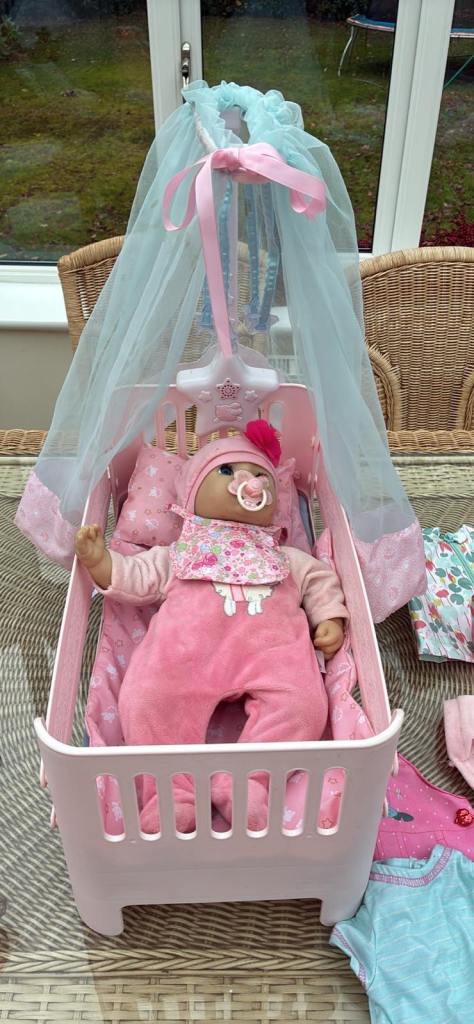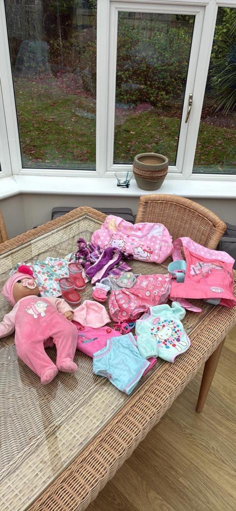 Baby Annabell complete with miscellaneous outfits, cot and high chair together with various accessories. Hardly used and in excellent condition as indicated by photographs. Ideal Christmas present.