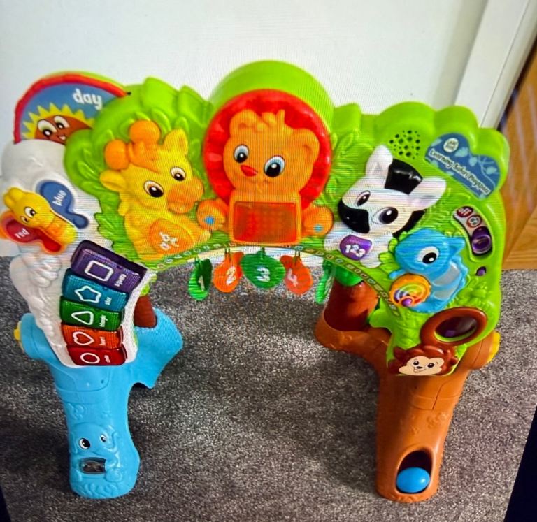 As seen in the photos, curved track (11), straight track (11), 5 points, 1 crossover, 1 engine shed, 2 tunnels, 3 bridges, several engines, carriages and goods, and more. Mostly Brio . Includes carry basket.