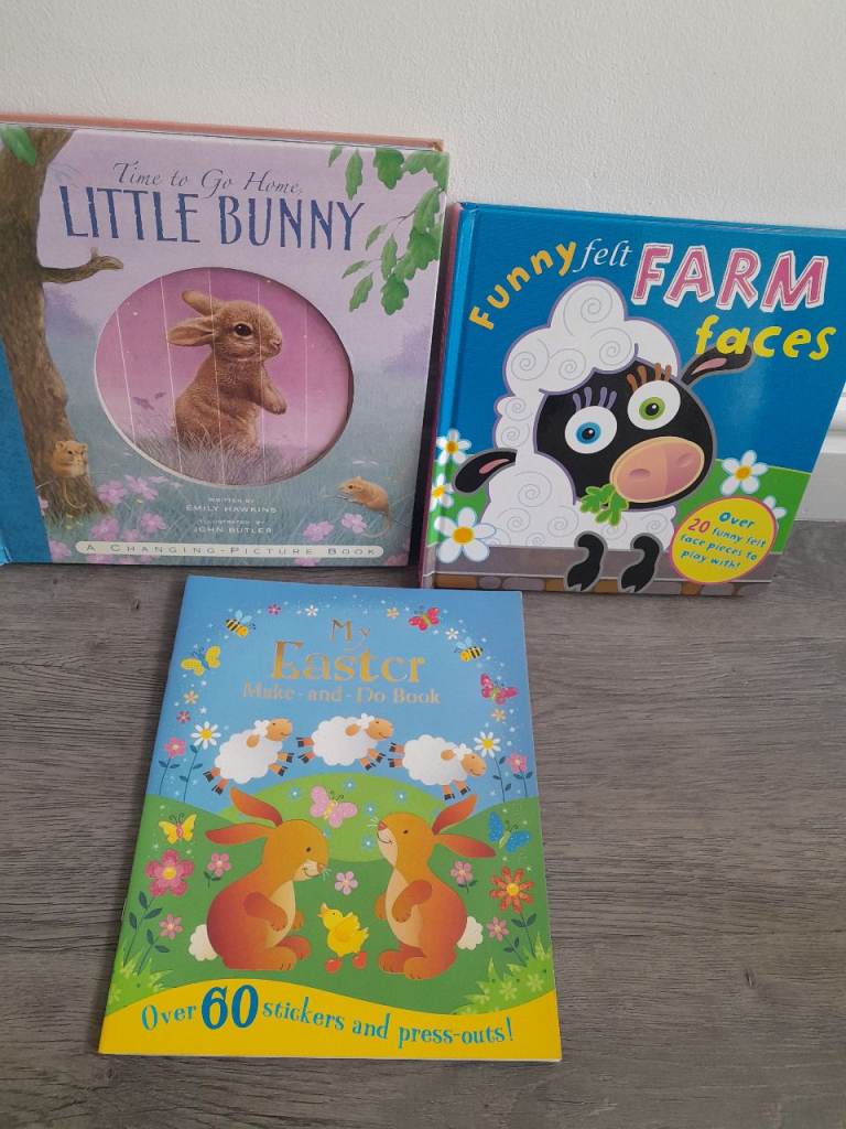 Children's Easter Book bundle. 1) Tine To Go Home Little Bunny - Hardback - as you open the pages the middle scene changes. A Very good quality and engaging book. 2) Funny Felt Farm Faces - hardback new. + 3) free Easter activity book