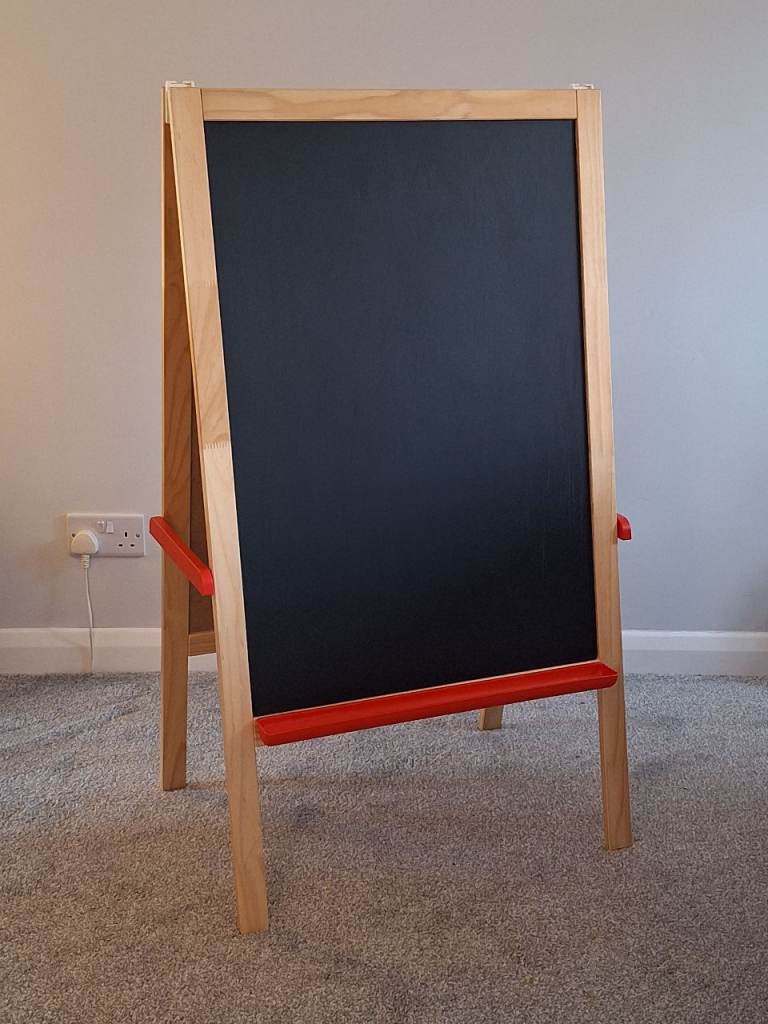 A lovely IKEA Mala children's easel with one side a dry-wipe marker whiteboard and the other side a chalkboard. You can also hang a roll of paper from the top for extra options with crafting.