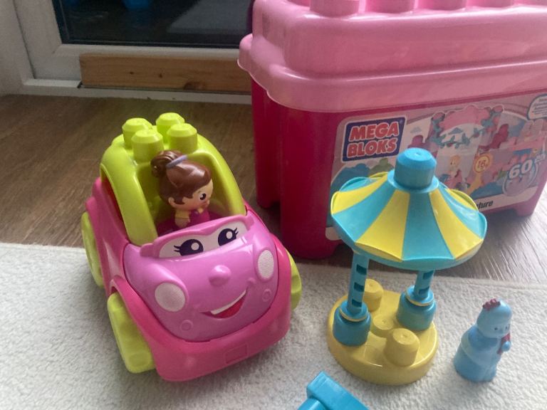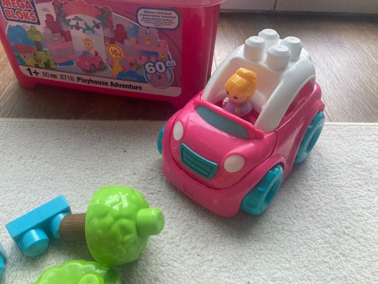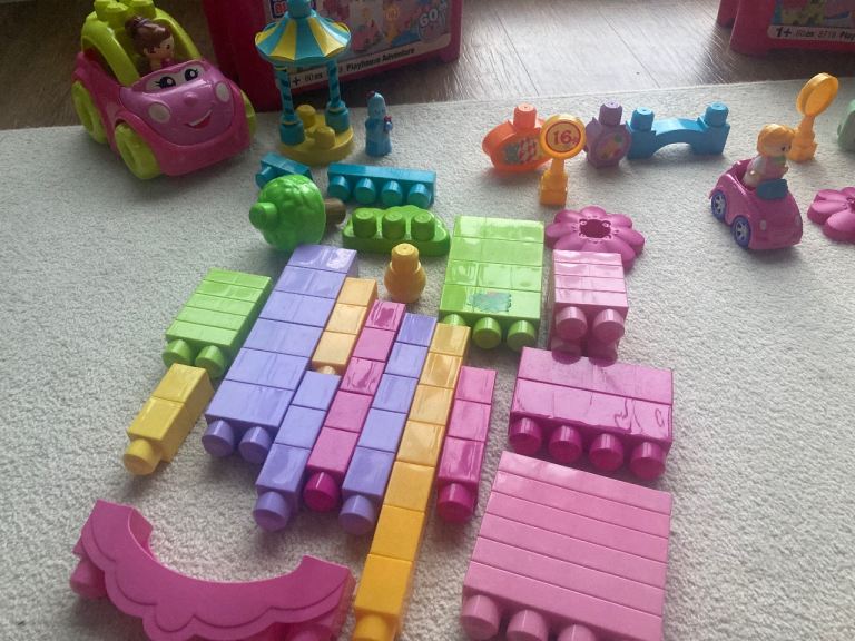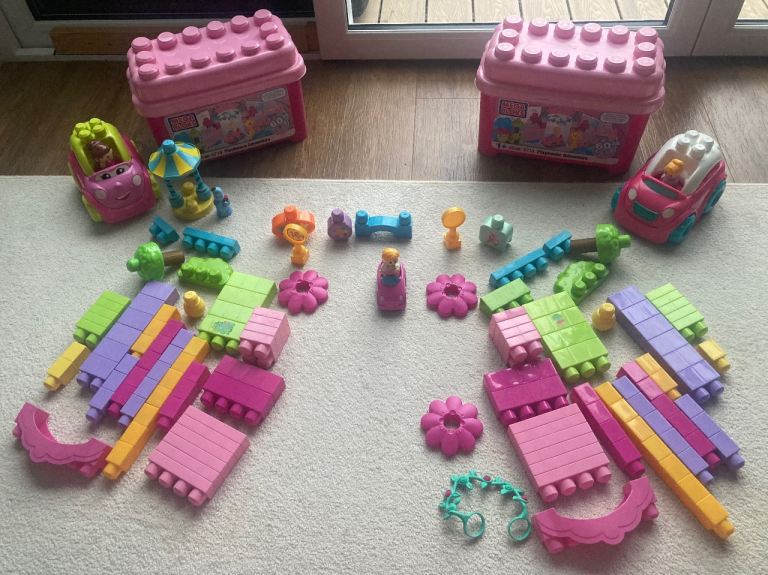 Two sets of mega bloks over 60 pieces each and two cars.