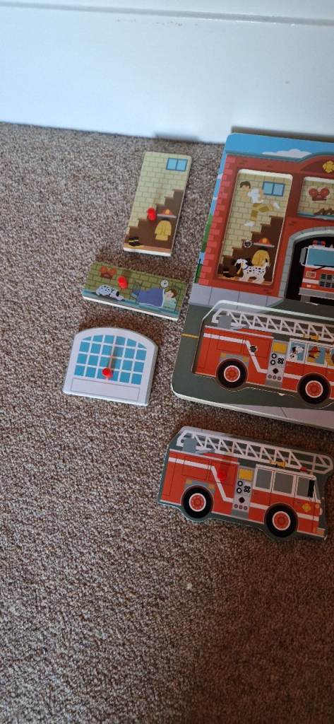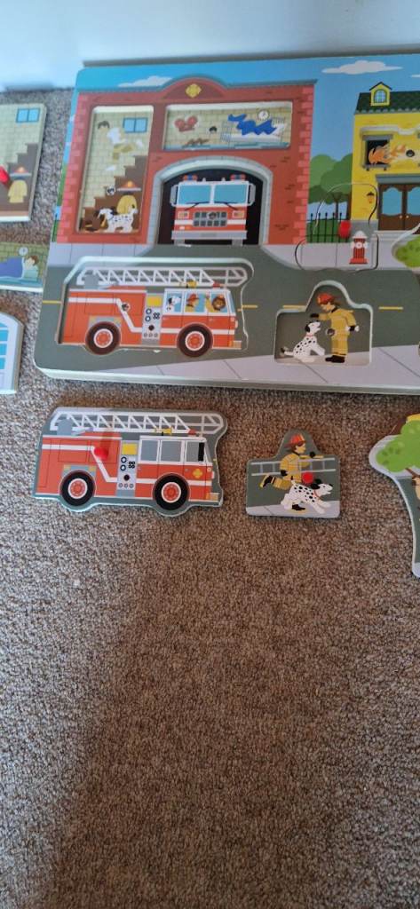 Interactive Fire Station Sound Puzzle – 8-piece wooden peg puzzle plays realistic fire station and neighborhood sounds when pieces are lifted, enhancing early learning through audio engagement.