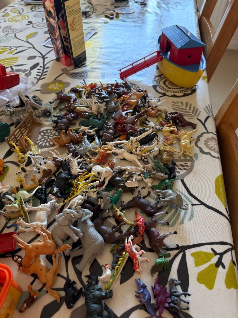 Noah’s Ark plus sets of animals 2x2! Also carrier bag of zoo & farm animals & flowers for a small play garden - all types, mainly plastic.