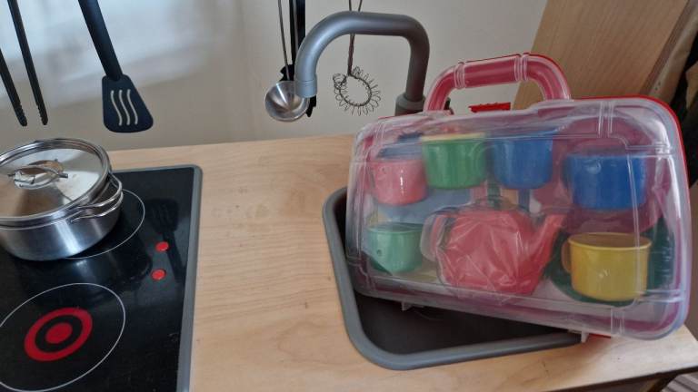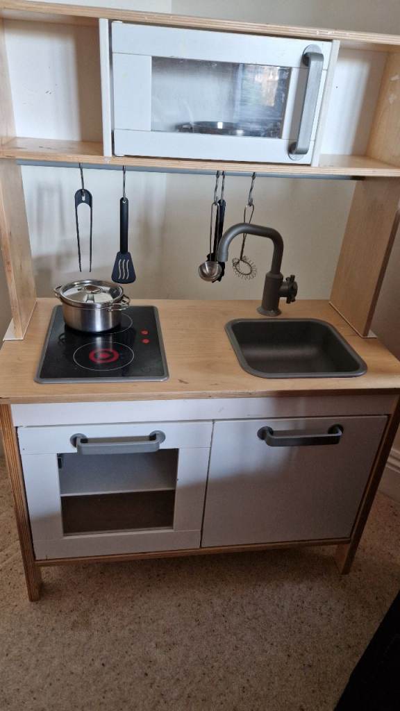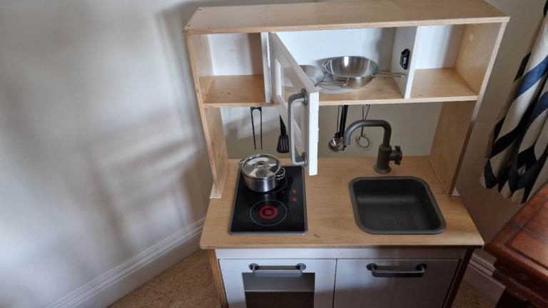 Ikea kitchen with pans and tea set. The toddler has loved making us cups of tea and serving them from this kitche. The hob lights up red when you turn it on.